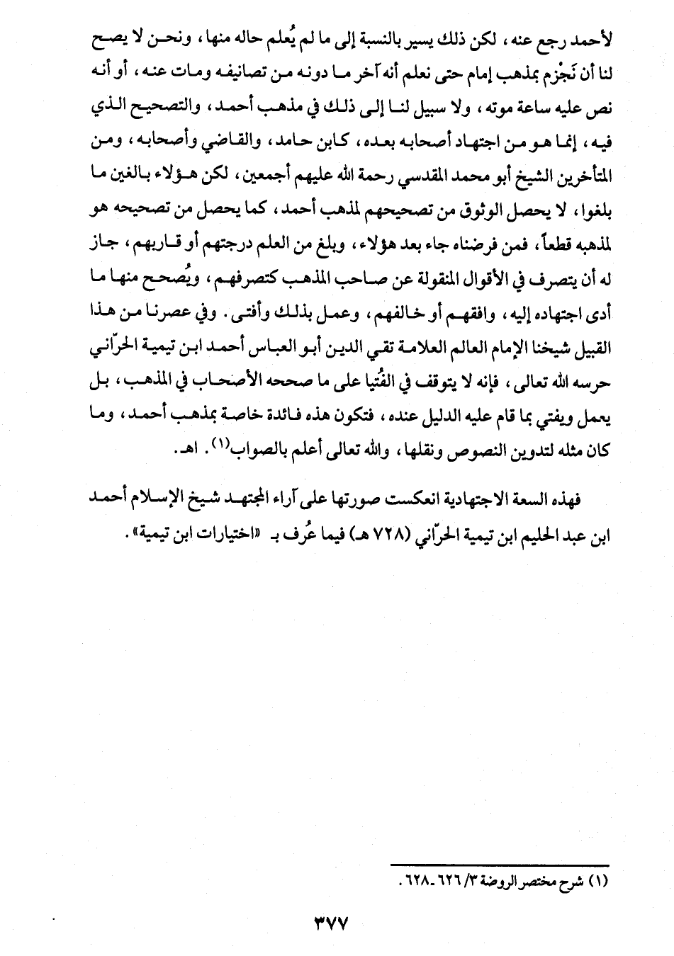لأحمد رجع عنه، لكن ذلك يسير بالنسبة إلى ما لم يُعلم حاله منها، ونحن لا يصح لنا أن نَجْزم بمذهب إمام حتى نعلم أنه آخر ما دونه من تصانيفه ومات عنه، أو أنه نص عليه ساعة موت، ولا سبيل لنا إلى ذلك في مذهب أحمد، والتصحيح الذي فيه، إنما هو من اجتهاد أصحابه بعده، كإبن حامد، والقاضي وأصحابه، ومن المتأخرين الشيخ أبو محمد المقدسي -رحمة الله عليهم أجمعين-، لكن هؤلاء بالغين ما بلغوا، لا يحصل الوثوق من تصحيحهم لذهب أحمد، كما يحصل من تصحيحه هو لمذهبه قطعاً، فمن فرضناه جاء بعد هؤلاء، وبلغ من العلم درجتهم أو قاربهم، جاز له أن يتصرف في الأقوال المنقولة عن صاحب المذهب كتصرفهم، ويُصحح منها ما أدى اجتهاده إليه، وافقهم أو خالفهم، وعمل بذلك وأفتى. وفي عصرنا من هذا القبيل شيخنا الإمام العالم العلامة تقي الدين أبو العباس أحمد ابن تيمية الحرّاني حرسه الله تعالى، فإنه لا يتوقف في الفُتيا على ما صححه الأصحاب في المذهب، بل يعمل ويفتي بما قام عليه الدليل عنده، فتكون هذه فائدة خاصة بمذهب أحمد، وما كان مثله لتدوين النصوص ونقلها، والله تعالى أعلم بالصواب (¬1). اهـ.