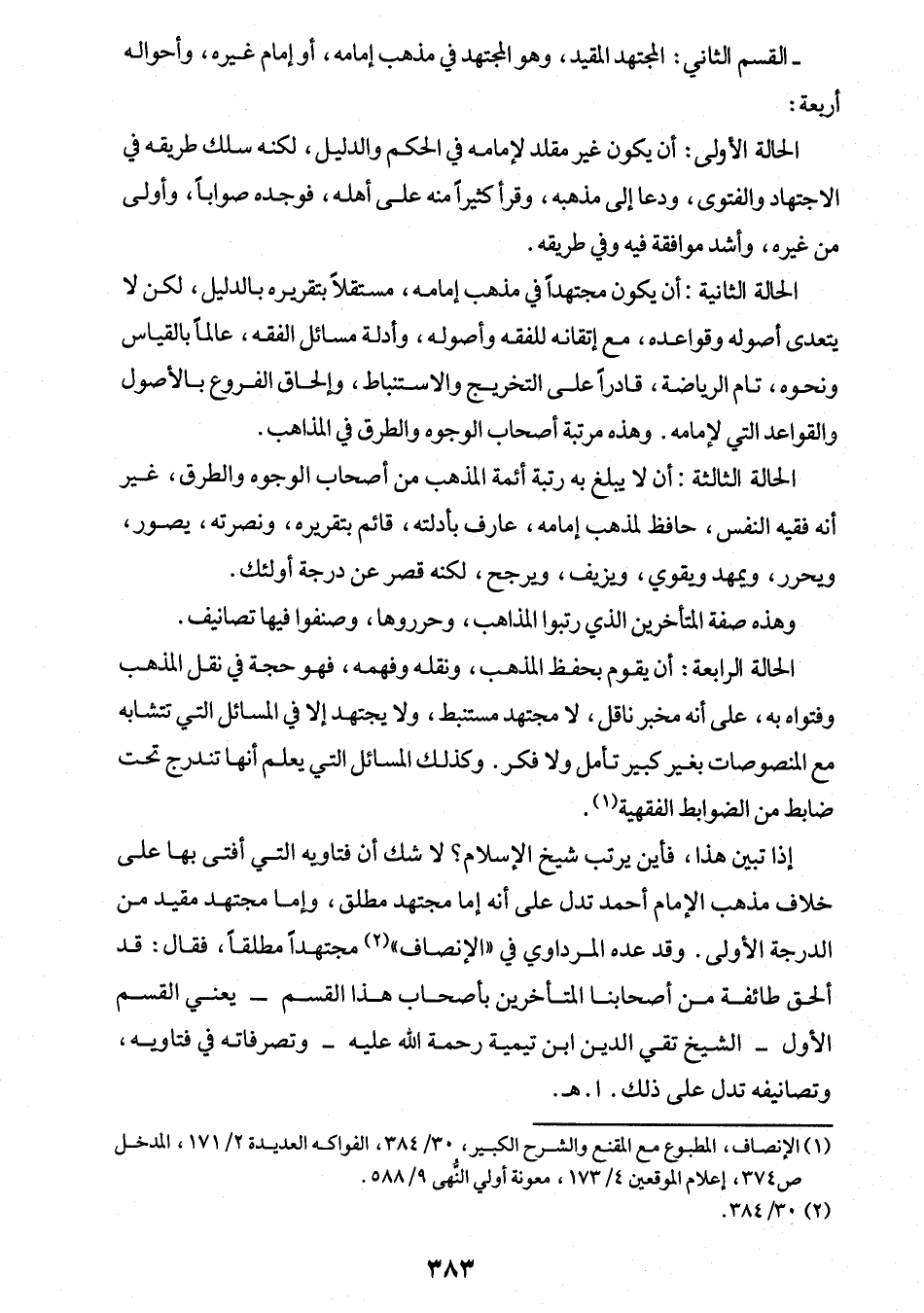- القسم الثاني: المجتهد المقيد، وهو المجتهد في مذهب إمامه، أو إمام غيره، وأحواله أربعة: