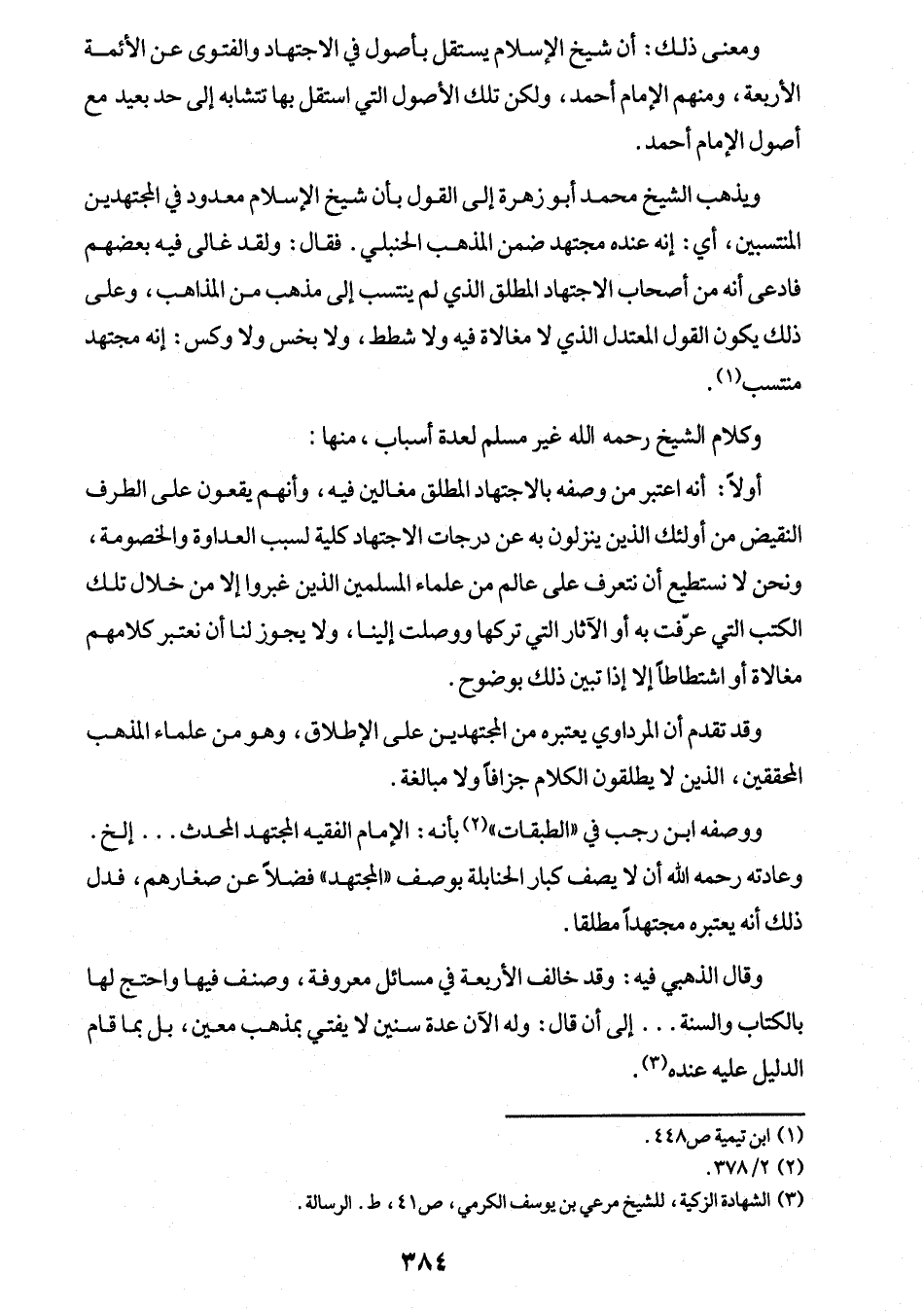 ويذهب الشيخ محمد أبو زهرة إلى القول بأن شيخ الإسلام معدود في المجتهدين المنتسبين، أي: إنه عنده مجتهد ضمن المذهب الحنبلي. فقال: ولقد غالى فيه بعضهم فادعى أنه من أصحاب الإجتهاد المطلق الذي لم ينتسب إلى مذهب من المذاهب، وعلى ذلك يكون القول المعتدل الذي لا مغالاة فيه ولا شطط، ولا بخس ولا وكس: إنه مجتهد منتسب (¬1).