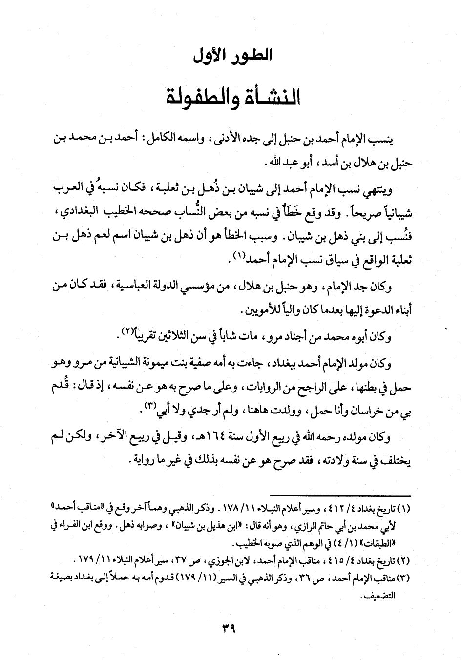 (¬3) مناقب الإمام أحمد، ص 36، وذكر الذهبي في السير (11/ 179) قدوم أمه به حملًا إلى بغداد بصيغة التضعيف.