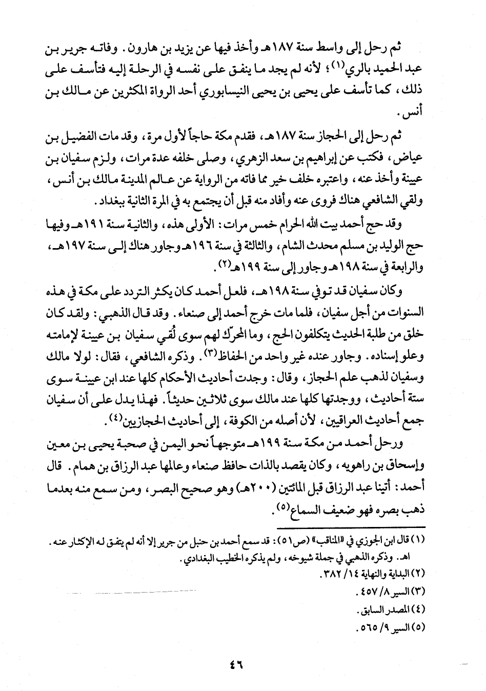 وكان سفيان قد توفي سنة 198 هـ، فلعل أحمد كان يكثر التردد على مكة في هذه السنوات من أجل سفيان، فلما مات خرج أحمد إلى صنعاء. وقد قال الذهبي: ولقد كان خلق من طلبة الحديث يتكلفون الحج، وما المحرك لهم سوى لُقي سفيان بن عيينة لإمامته وعلو إسناده. وجاور عنده غير واحد من الحفاظ (¬3). وذكره الشافعي، فقال: لولا مالك وسفيان لذهب علم الحجاز، وقال: وجدت أحاديث الأحكام كلها عند ابن عيينة سوى ستة أحاديث، ووجدتها كلها عند مالك سوى ثلاثين حديثًا. فهذا يدل على أن سفيان جمع أحاديث العراقيين، لأن أصله من الكوفة، إلى أحاديث الحجازيين (¬4).