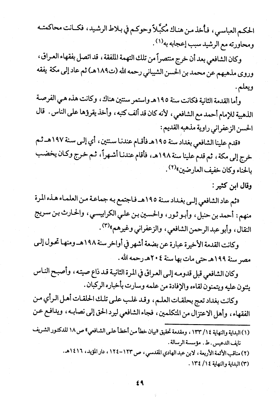 "ثم عاد الشافعي إلى بغداد سنة 195 هـ فاجتمع به جماعة من العلماء هذه المرة منهم: أحمد بن حنبلْ، وأبو ثور، والحسين بن علي الكراييسي، والحارث بن سريج النقال، وأبو عبد الرحمن الشافعي، والزعفراني وغيرهم" (¬3).