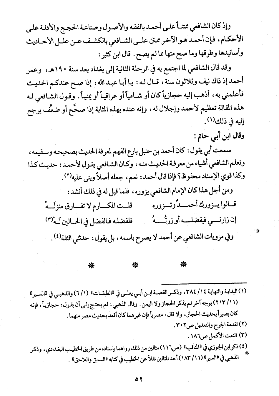 وقد قال الشافعي لما اجتمع به في الرحلة الثانية إلى بغداد بعد سنة 190 هـ، وعمر أحمد إذ ذاك نيف وثلاثون سنة، قال له: يا أبا عبد الله، إذا صح عندكم الحديث فاعلمني به، أذهب إليه حجازيًا كان أو شاميًا أو عراقيًا أو يمنيًا. وقول الشافعي له هذه المقالة تعظيم لأحمد واجلال له، وإنه عنده بهذه المثابة إذا صحَّح أو ضعَّف يرجع إليه في ذلك (¬1).