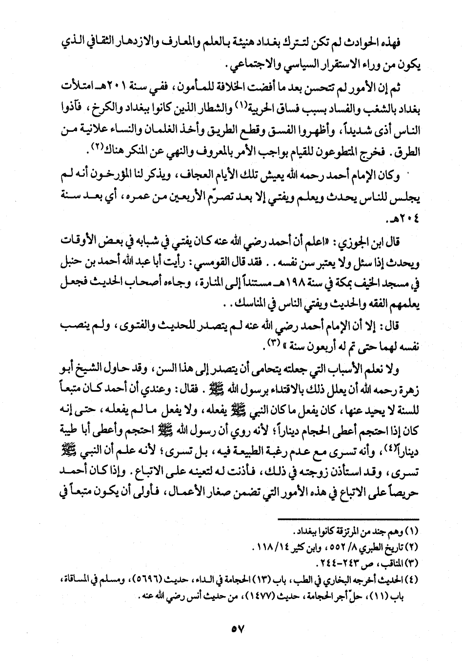 ولا نعلم الأسباب التي جعلته يتحامى أن يتصدر إلى هذا السن، وقد حاول الشيخ أبو زهرة -رَحِمَهُ اللهُ- أن يعلل ذلك بالإقتداء برسول الله - صلى الله عليه وسلم -. فقال: وعندي أن أحمد كان متبعًا للسنة لا يحيد عنها، كان يفعل ما كان النبي - صلى الله عليه وسلم - يفعله، ولا يفعل ما لم يفعله، حتى إنه كان اذا احتجم أعطى الحجام دينارًا؛ لأنه روي أن رسول الله - صلى الله عليه وسلم - احتجم وأعطى أبا طيبة دينارًا (¬4)، وأنه تسرى مع عدم رغبة الطبيعة فيه، بل تسرى؛ لأنه علم أن النبي - صلى الله عليه وسلم - تسرى، وقد استأذن زوجته في ذلك، فأذنت له لتعينه على الإتباع. إذا كان أحمد حريصًا على الإتباع في هذه الأمور التي تضمن صغار الأعمال، فأولى أن يكون متبعًا في