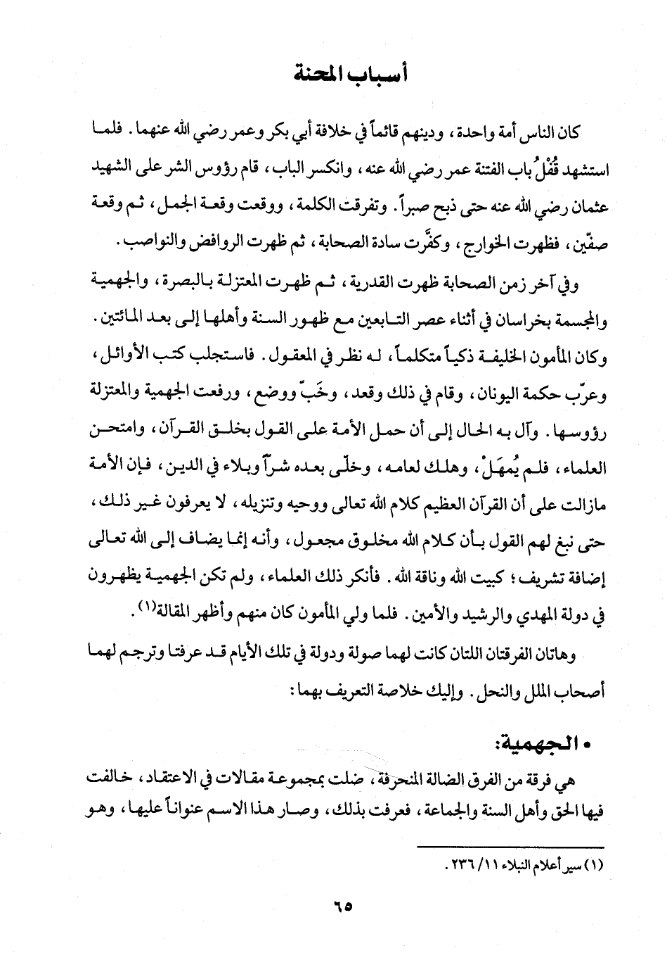 وفي آخر زمن الصحابة ظهرت القدرية، ثم ظهرت المعتزلة بالبصرة، والجهمية والمجسمة بخراسان في أثناء عصر التابعين مع ظهور السنة وأهلها إلى بعد المائتين. وكان المأمون الخليفة ذكيًا متكلمًا، له نظر في المعقول. فاستجلب كتب الأوائل، وعرب حكمة اليونان، وقام في ذلك وقعد، وخَبّ ووضع، ورفعت الجهمية والمعتزلة رؤوسها. وآل به الحال إلى أن حمل الأمة على القول بخلق القرآن، وامتحن العلماء، فلم يُمهَلْ، وهلك دعامه، وخلّى بعده شرًّا وبلاء في الدين، فإن الأمة مازالت على أن القرآن العظيم كلام الله تعالى ووحيه وتنزيله، لا يعرفون غير ذلك، حتى نبغ لهم القول بأن كلام الله مخلوق مجعول، وأنه إنما يضاف إلى الله تعالى إضافة تشريف؛ كبيت الله وناقة الله. فأنكر ذلك العلماء، ولم تكن الجهمية يظهرون في دولة المهدي والرشيد والأمين. فلما ولي المأمون كان منهم وأظهر المقالة (¬1).