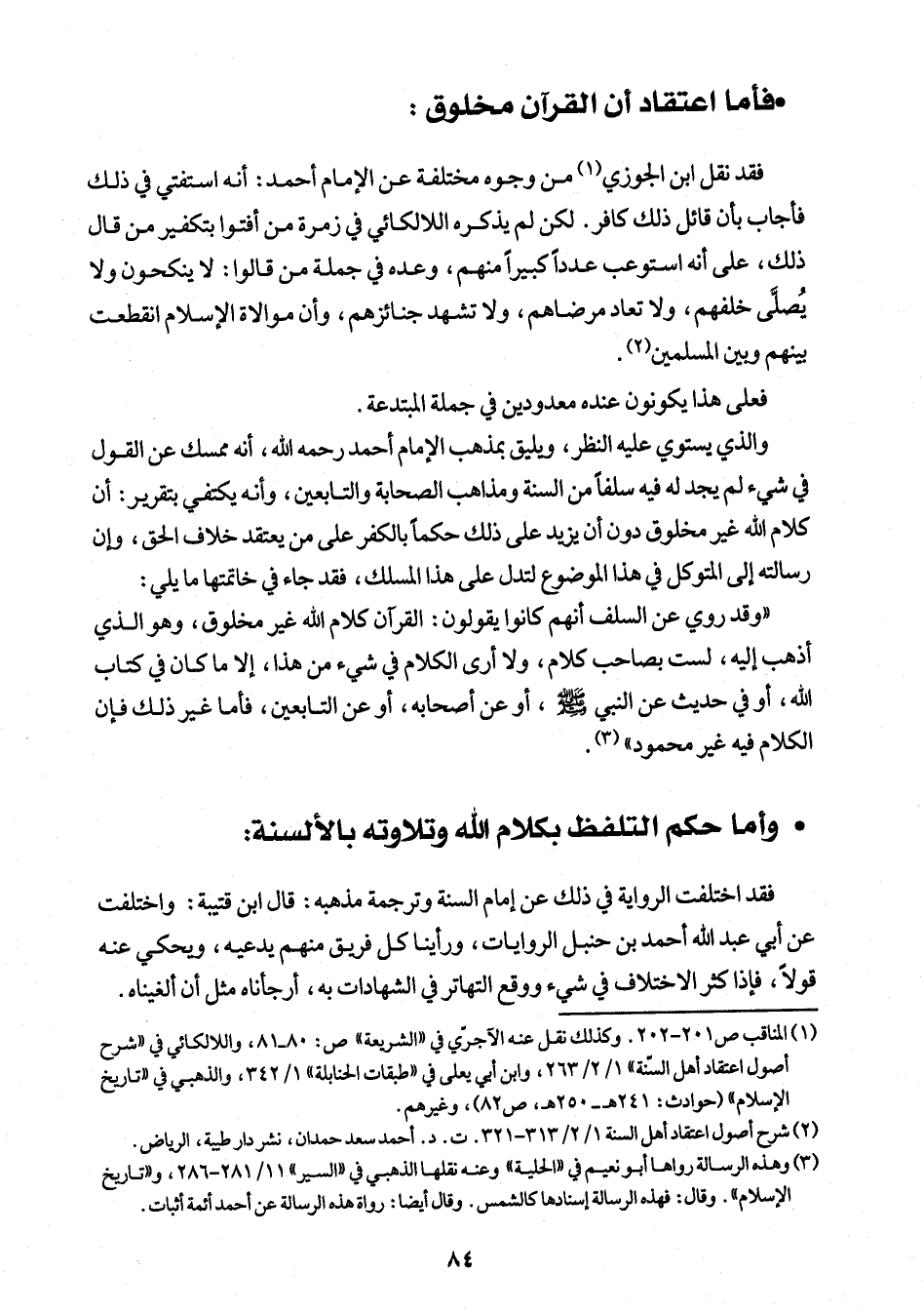 والذي يستوي عليه النظر، ويليق بمذهب الإمام أحمد -رَحِمَهُ اللهُ-، أنه ممسك عن القول في شيء لم يجد له فيه سلفًا من السنة ومذاهب الصحابة والتابعين، وأنه يكتفي بتقرير: أن كلام الله غير مخلوق دون أن يزيد على ذلك حكمًا بالكفر على من يعتقد خلاف الحق، وإن رسالته إلى المتوكل في هذا الموضوع لتدل على هذا المسلك، فقد جاء في خاتمتها ما يلي: