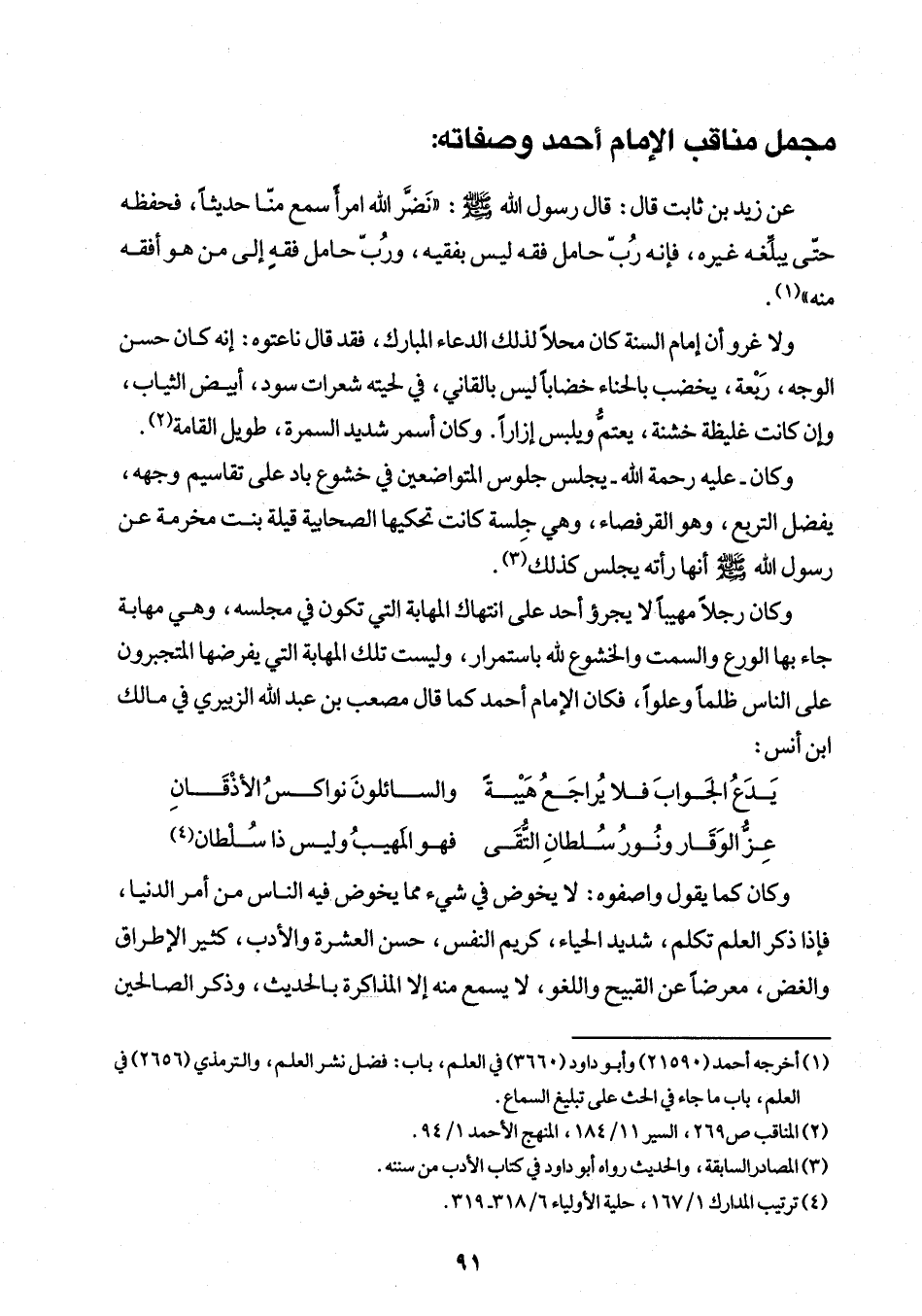 ولا غرو أن إمام السنة كان محلًا لذلك الدعاء المبارك، فقد قال ناعتوه: إنه كان حسن الوجه، رَبْعة، يخضب بالحناء خضابًا ليس بالقاني، في لحيته شعرات سود، أبيض الثياب، وإن كانت غليظة خشنة، يعتمُّ ويلبس إزارًا. وكان أسمر شديد السمرة، طويل القامة (¬2).