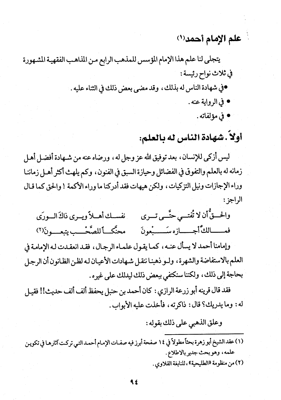 (¬1) عقد الشيخ أبو زهرة بحثاً مطولاً في 14 صفحة أبرز في صفات الإمام أحمد التي تركت آثارها في تكوين علمة، وهو بحث جدير بالإطلاع.