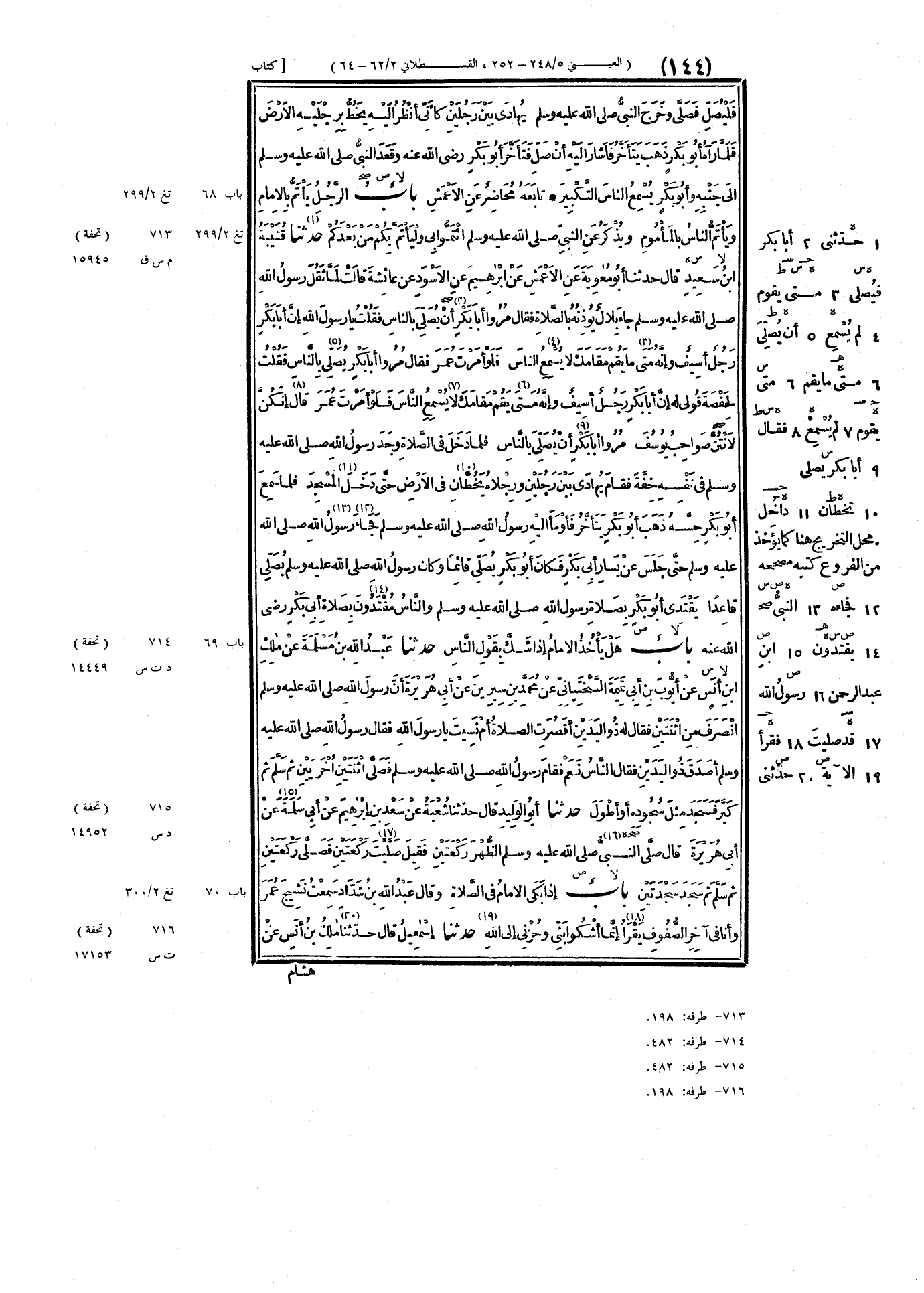 ٧١٣ - حَدَّثَنَا قُتَيْبَةُ بْنُ سَعِيدٍ، قَالَ: حَدَّثَنَا أَبُو مُعَاوِيَةَ، عَنِ الأَعْمَشِ، عَنْ إِبْرَاهِيمَ، عَنِ الأَسْوَدِ، عَنْ عَائِشَةَ، قَالَتْ: لَمَّا ثَقُلَ رَسُولُ اللَّهِ صَلَّى اللهُ عَلَيْهِ وَسَلَّمَ جَاءَ بِلَالٌ يُوذِنُهُ بِالصَّلَاةِ، فَقَالَ: «مُرُوا أَبَا بَكْرٍ أَنْ يُصَلِّيَ بِالنَّاسِ»، فَقُلْتُ: يَا رَسُولَ اللَّهِ إِنَّ أَبَا بَكْرٍ رَجُلٌ أَسِيفٌ وَإِنَّهُ مَتَى مَا يَقُمْ مَقَامَكَ لَا يُسْمِعُ النَّاسَ، فَلَوْ أَمَرْتَ عُمَرَ، فَقَالَ: «مُرُوا أَبَا بَكْرٍ يُصَلِّي بِالنَّاسِ» فَقُلْتُ لِحَفْصَةَ: قُولِي لَهُ: إِنَّ أَبَا بَكْرٍ رَجُلٌ أَسِيفٌ، وَإِنَّهُ مَتَى يَقُمْ مَقَامَكَ لَا يُسْمِعُ النَّاسَ، فَلَوْ أَمَرْتَ عُمَرَ، قَالَ: «إِنَّكُنَّ لَأَنْتُنَّ صَوَاحِبُ يُوسُفَ، مُرُوا أَبَا بَكْرٍ أَنْ يُصَلِّيَ بِالنَّاسِ» فَلَمَّا دَخَلَ فِي الصَّلَاةِ وَجَدَ رَسُولُ اللَّهِ صَلَّى اللهُ عَلَيْهِ وَسَلَّمَ فِي نَفْسِهِ خِفَّةً، فَقَامَ يُهَادَى بَيْنَ رَجُلَيْنِ، وَرِجْلَاهُ يَخُطَّانِ فِي الأَرْضِ، حَتَّى دَخَلَ المَسْجِدَ، فَلَمَّا سَمِعَ أَبُو بَكْرٍ حِسَّهُ، ذَهَبَ أَبُو بَكْرٍ يَتَأَخَّرُ، فَأَوْمَأَ إِلَيْهِ رَسُولُ اللَّهِ صَلَّى اللهُ عَلَيْهِ وَسَلَّمَ، فَجَاءَ رَسُولُ اللَّهِ صَلَّى اللهُ عَلَيْهِ وَسَلَّمَ حَتَّى جَلَسَ عَنْ يَسَارِ أَبِي بَكْرٍ، فَكَانَ أَبُو بَكْرٍ يُصَلِّي قَائِمًا، وَكَانَ رَسُولُ اللَّهِ صَلَّى اللهُ عَلَيْهِ وَسَلَّمَ يُصَلِّي قَاعِدًا، يَقْتَدِي أَبُو بَكْرٍ بِصَلَاةِ رَسُولِ اللَّهِ صَلَّى اللهُ عَلَيْهِ وَسَلَّمَ وَالنَّاسُ مُقْتَدُونَ بِصَلَاةِ أَبِي بَكْرٍ رَضِيَ اللَّهُ عَنْهُ