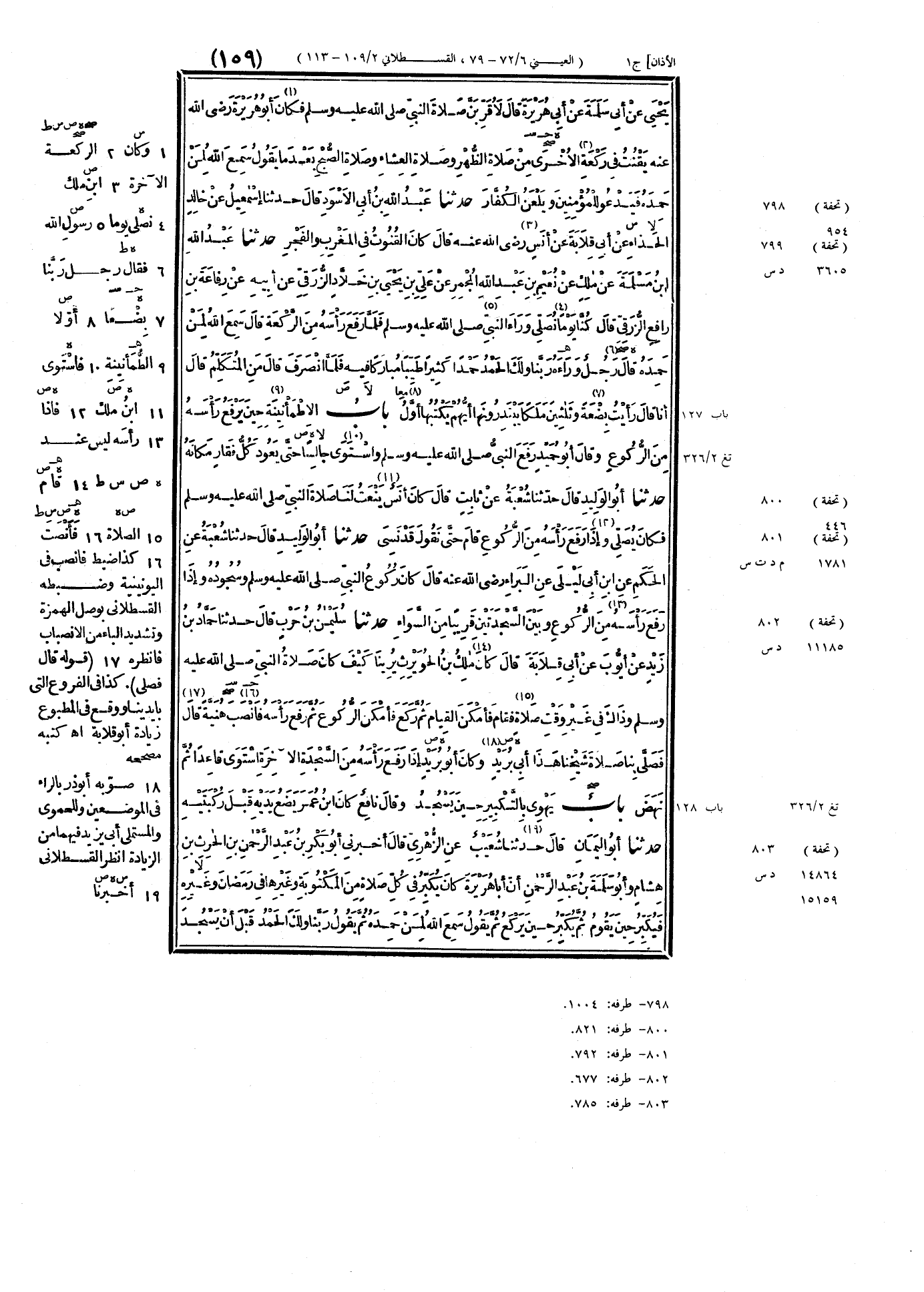 ٧٩٩ - حَدَّثَنَا عَبْدُ اللَّهِ بْنُ مَسْلَمَةَ، عَنْ مَالِكٍ، عَنْ نُعَيْمِ بْنِ عَبْدِ اللَّهِ المُجْمِرِ، عَنْ عَلِيِّ بْنِ يَحْيَى بْنِ خَلَّادٍ الزُّرَقِيِّ، عَنْ أَبِيهِ، عَنْ رِفَاعَةَ بْنِ رَافِعٍ الزُّرَقِيِّ، قَالَ: " كُنَّا يَوْمًا نُصَلِّي وَرَاءَ النَّبِيِّ صَلَّى اللهُ عَلَيْهِ وَسَلَّمَ، فَلَمَّا رَفَعَ رَأْسَهُ مِنَ الرَّكْعَةِ قَالَ: سَمِعَ اللَّهُ لِمَنْ حَمِدَهُ "، قَالَ رَجُلٌ وَرَاءَهُ: رَبَّنَا وَلَكَ الحَمْدُ حَمْدًا كَثِيرًا طَيِّبًا مُبَارَكًا فِيهِ، فَلَمَّا انْصَرَفَ، قَالَ: «مَنِ المُتَكَلِّمُ» قَالَ: أَنَا، قَالَ: «رَأَيْتُ بِضْعَةً وَثَلَاثِينَ مَلَكًا يَبْتَدِرُونَهَا أَيُّهُمْ يَكْتُبُهَا أَوَّلُ»
