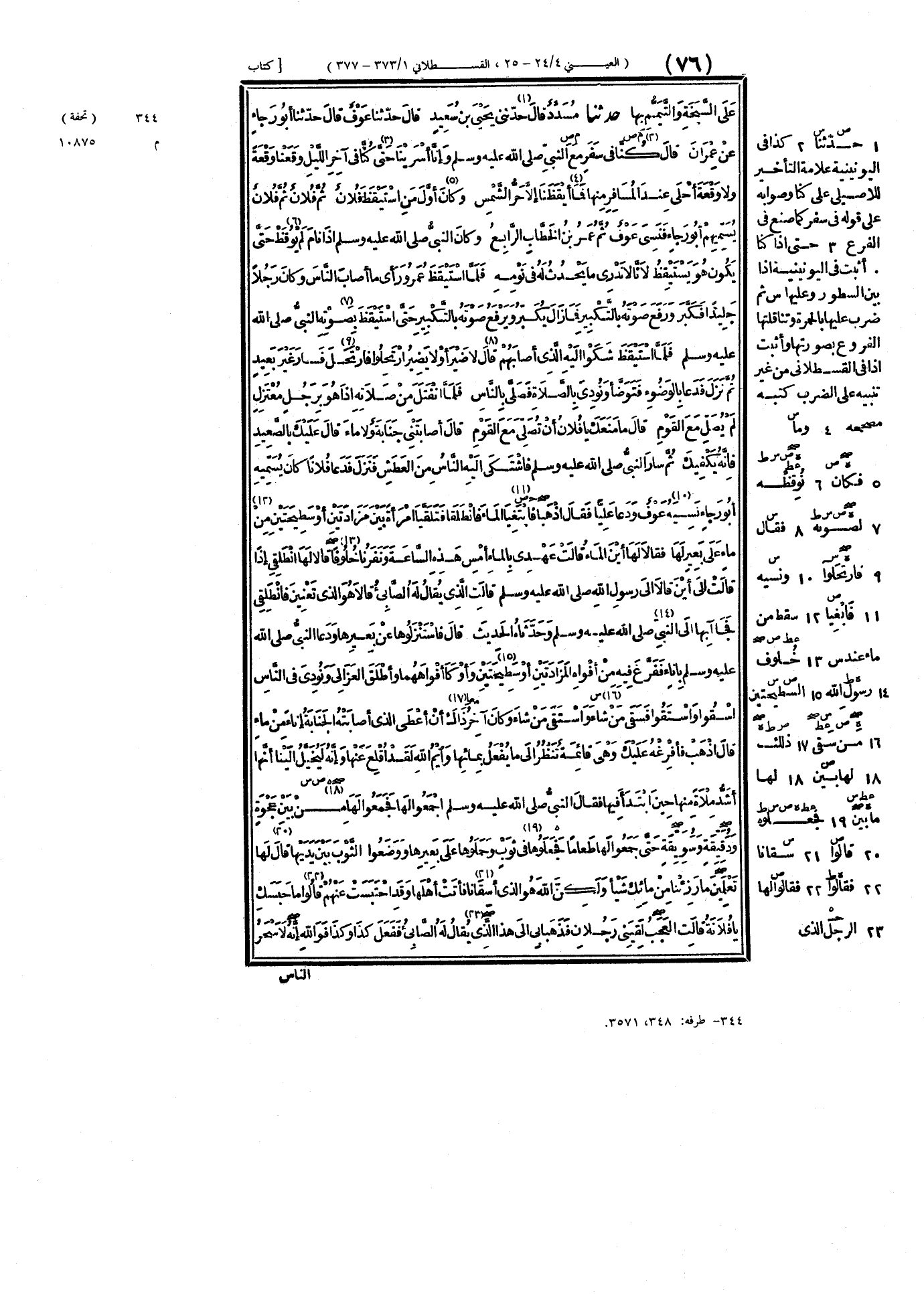 (أسرينا) من السري وهو السير أكثر الليل وقيل السير كل الليل. (وقعنا وقعة) نمنا نومة. (فلان) ذكر البخاري في علامات النبوة أن أول من استيقظ أبو بكر وقيل الثاني هوعمران والثالث هو ذو مخبر. (ما يحدث له في نومه) أي من الوحي ونخاف أن نقطعه بإيقاظه. (جليدا) ظاهر الجلادة وهي القوة والصلابة. (لا ضير) لا ضرر. (برجل) هو خلاد بن رافع. (عليك بالصعيد) أي الزمه وتيمم به والصعيد التراب أو سطح الأرض مطلقا. (فابتغيا) من الابتغاء وهو الطلب. (مزادتين) مثنى مزادة وهي القربة الكبيرة سميت بذلك لأنها يزاد فيها جلد آخر من غيرها وتسمى أيضا سطيحة. (عهدي بالماء أمس) تركت الماء منذ أمس وهو اليوم الذي قبل يومك. (هذه الساعة) في مثل هذه الساعة. (نفرنا) رجالنا. (خلوف) متخلفون لطلب الماء وقيل جمع خالف وهو المسافر أي ذهبوا وخلفوا النساء وحدهن في الحي. (الصابىء) من صبأ إذا خرج من دين إلى دين آخر. (أوكأ) ربط. (العزالي) جمع عزلاء وهي فم المزادة الأسفل الذي يخرج منه الماء بكثرة. (وايم الله) اسم وضع للقسم أصله أيمن الله فحذفت النون تخفيفا وربما وصلت همزته وربما قطعت. (أقلع عنها) كف عنها. (أشد ملأة) ما بقي فيها من الماء أكثر مما كان أولا. (دقيقة وسويقة) طحين الحنطة والشعير وغيرهما. (فجعلوهما) وضعوا الأشياء التي جمعوها. (قال لها) أي رسول الله صلى الله عليه وسلم وفي رواية (قالوا لها) أي القوم بأمره. (رزئنا) نقصنا. (احتبست عنهم) تأخرت. (وقالت بأصبعها) أشارت بهما. (الصرم) هو بيوت مجتمعة منقطعة عن الناس. (ما أرى) ظني وعلمي. (يدعونكم عمدا) يتركونكم عن قصد لا غفلة منهم عنكم]