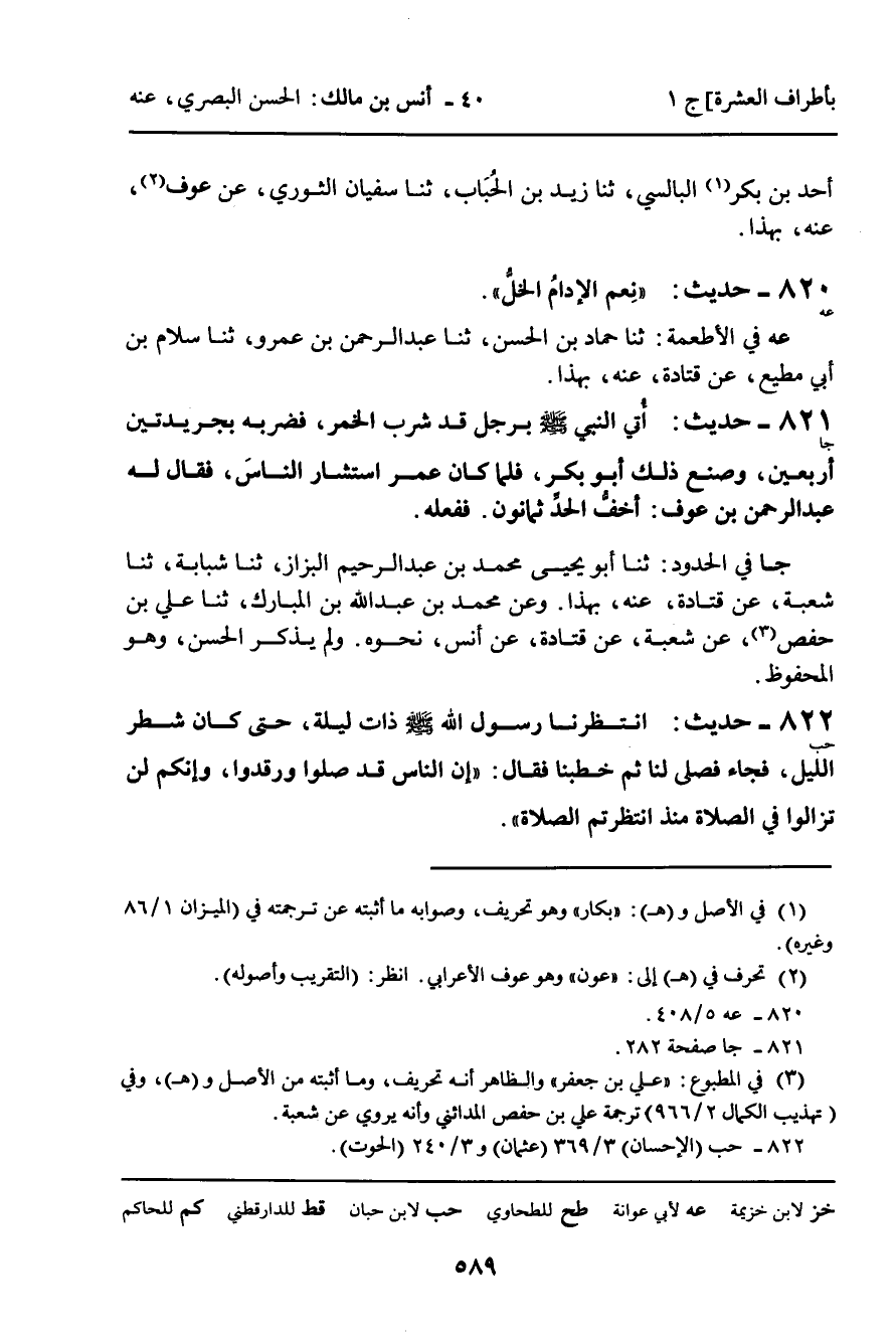 821 - حَدِيثٌ (جا) : أُتِيَ النَّبِيُّ , صَلَّى اللَّهُ عَلَيْهِ وَسَلَّمَ، بِرَجُلٍ قَدْ شَرِبَ الْخَمْرَ , فَضَرَبَهُ بِجَرِيدَتَيْنِ أَرْبَعِينَ , وَصَنَعَ ذَلِكَ أَبُو بَكْرٍ , فَلَمَّا كَانَ عُمَرُ اسْتَشَارَ النَّاسَ , فَقَالَ لَهُ عَبْدُ الرَّحْمَنِ بْنُ عَوْفٍ: أَخَفُّ الْحَدِّ ثَمَانُونَ. فَفَعَلَهُ.