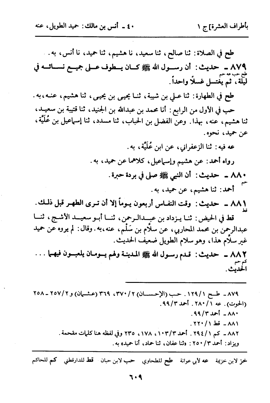 879 - حَدِيثٌ (طح حب عه حم) : أَنَّ رَسُولَ اللَّهِ , صَلَّى اللَّهُ عَلَيْهِ وَسَلَّمَ , كَانَ يَطُوفُ عَلَى جَمِيعِ نِسَائِهِ فِي لَيْلَةٍ , ثُمَّ يَغْتَسِلُ غُسْلا وَاحِدًا.