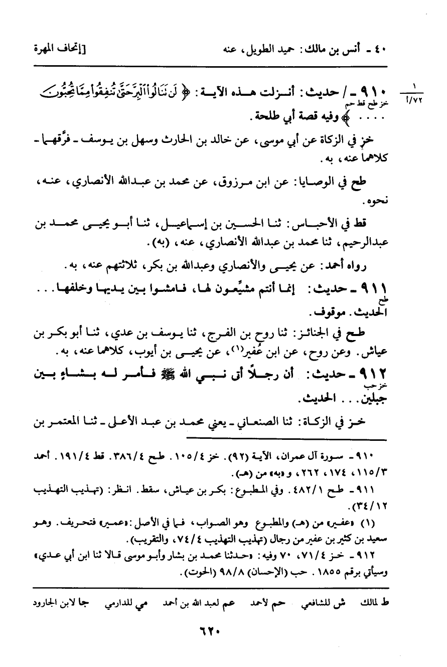 910 - حَدِيثٌ (خز طح قط حم) : أُنْزِلَتْ هَذِهِ الآيَةُ: لَنْ تَنَالُوا الْبِرَّ حَتَّى تُنْفِقُوا مِمَّا تُحِبُّونَ [سورة: آل عمران، آية 92] وَفِيهِ قِصَّةُ أَبِي طَلْحَةَ.