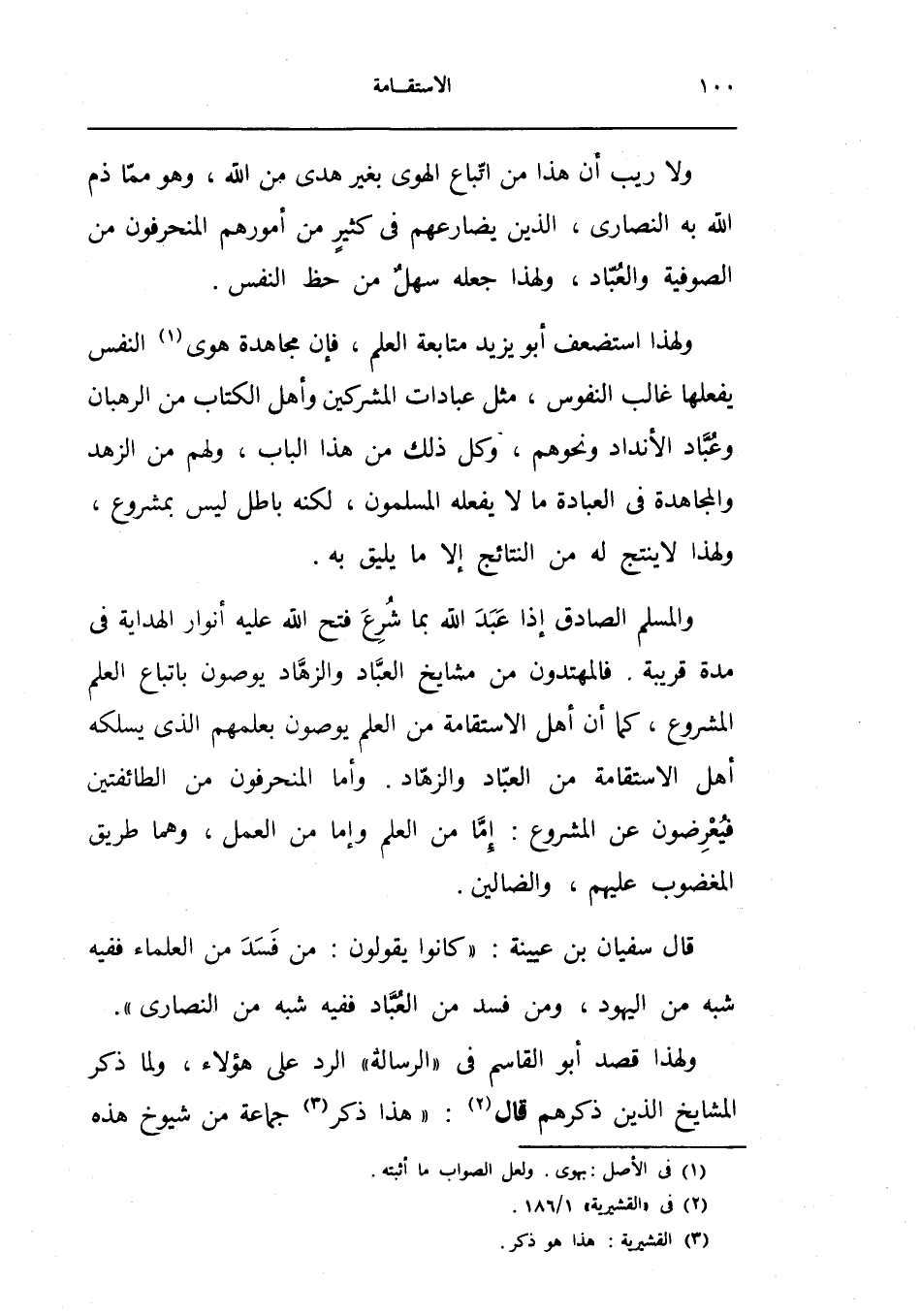 وَالْمُسلم الصَّادِق إِذا عبد الله بِمَا شرع فتح الله عَلَيْهِ أنوار الْهِدَايَة فِي مُدَّة قريبَة فالمهتدون من مَشَايِخ الْعباد والزهاد يوصون بإتباع الْعلم الْمَشْرُوع كَمَا ان أهل الاسْتقَامَة من الْعلم يوصون بعلمهم الَّذِي يسلكه أهل الاسْتقَامَة من الْعباد والزهاد وَأما المنحرفون من الطَّائِفَتَيْنِ فيعرضون عَن الْمَشْرُوع إِمَّا من الْعلم وَإِمَّا من الْعَمَل وهما طَرِيق المغضوب عَلَيْهِم والضالين