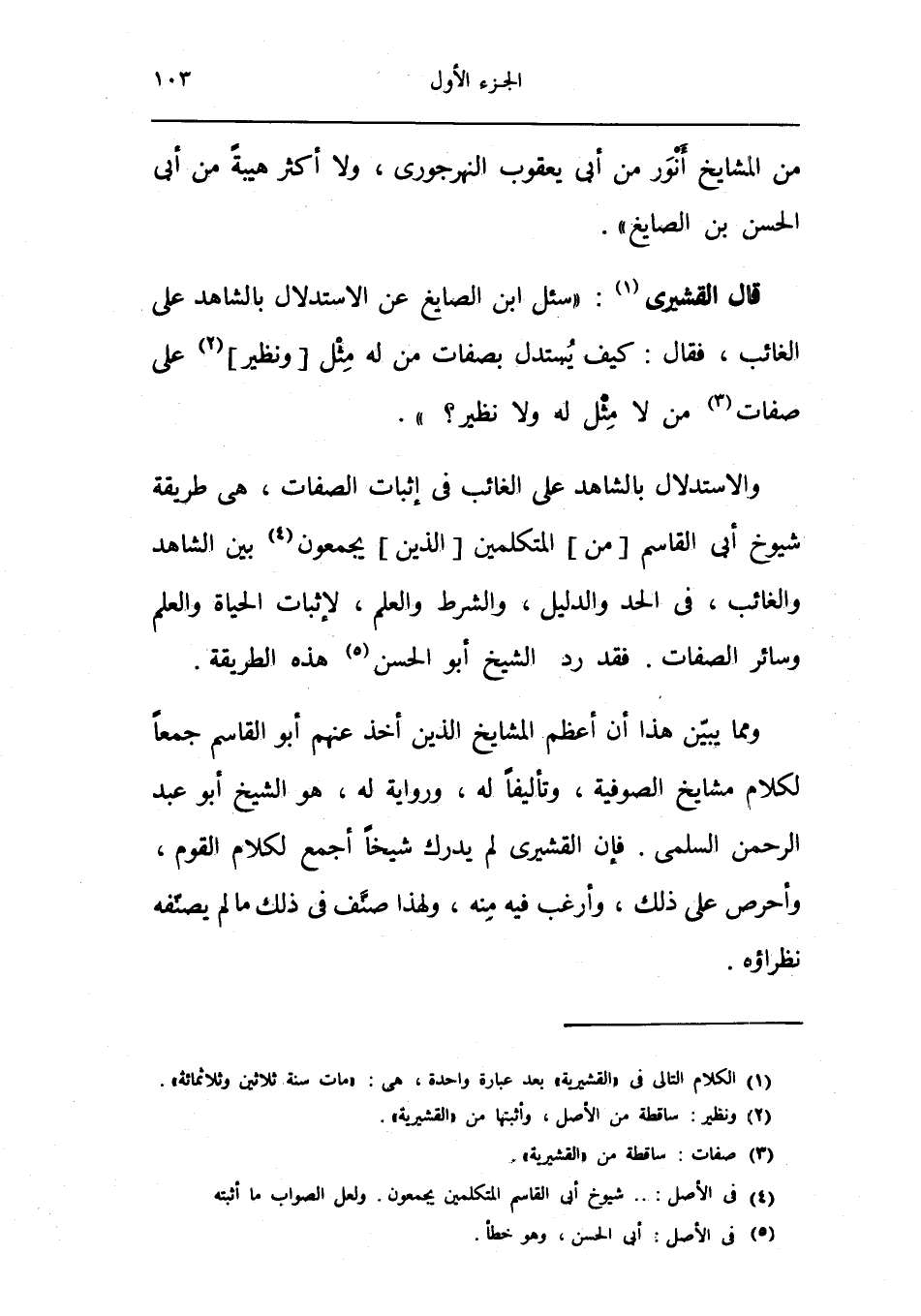 وَمِمَّا يبين هَذَا أَن أعظم الْمَشَايِخ الَّذين أَخذ عَنْهُم أَبُو الْقَاسِم جمعا لكَلَام مَشَايِخ الصُّوفِيَّة وتأليفا لَهُ وَرِوَايَة لَهُ هُوَ الشَّيْخ أَبُو عبد الرَّحْمَن السلمى فَإِن القشيرى لم يدْرك شَيخا أجمع لكَلَام الْقَوْم وأحرص على ذَلِك وأرغب فِيهِ مِنْهُ وَلِهَذَا صنف فِي ذَلِك مَا لم يصنفه نظراؤه