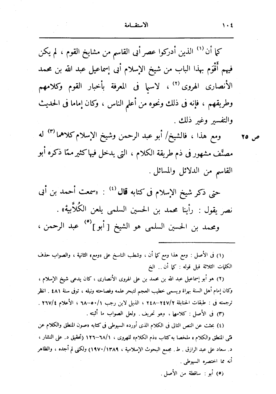 وَمَعَ هَذَا فالشيخ أَبُو عبد الرَّحْمَن وَشَيخ الْإِسْلَام كِلَاهُمَا لَهُ مُصَنف مَشْهُور فِي ذمّ طَريقَة الْكَلَام الَّتِي يدْخل فِيهَا كثير مِمَّا ذكره أَبُو الْقَاسِم من الدَّلَائِل والمسائل