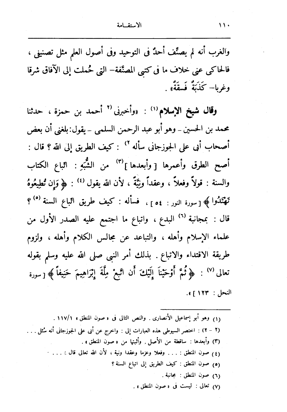 وَقَالَ شيخ الْإِسْلَام وَأَخْبرنِي أَحْمد بن حَمْزَة حَدثنَا مُحَمَّد بن الْحُسَيْن وَهُوَ أَبُو عبد الرَّحْمَن السلمى يَقُول بَلغنِي أَن بعض أَصْحَاب أبي عَليّ الجوزاني سَأَلَهُ كَيفَ الطَّرِيق إِلَى الله قَالَ أصح الطّرق وأعمرها وأبعدها من الشّبَه اتِّبَاع الْكتاب وَالسّنة قولا وفعلا وعقدا وَنِيَّة لِأَن الله يَقُول وتطيعوه تهتدوا [سُورَة النُّور 54] فَسَأَلَهُ كَيفَ طَرِيق اتِّبَاع السّنة قَالَ بمجانبة الْبدع وَاتِّبَاع مَا اجْتمع عَلَيْهِ الصَّدْر الأول من عُلَمَاء الْإِسْلَام وَأَهله والتباعد عَن مجَالِس الْكَلَام واهله وَلُزُوم طَريقَة الِاقْتِدَاء والاتباع بذلك أَمر النَّبِي صلى الله عَلَيْهِ وَسلم بقوله تَعَالَى ثمَّ أَوْحَينَا إِلَيْك أَن اتبع مِلَّة ابراهيم حَنِيفا [سُورَة النَّحْل 123]