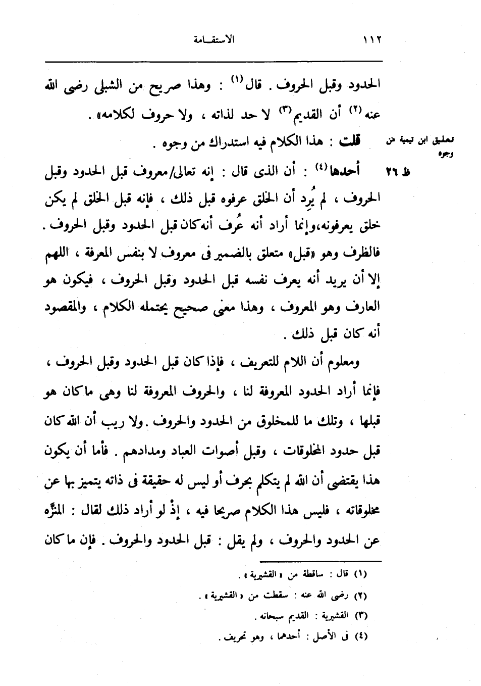 وَمَعْلُوم ان اللَّام للتعريف فَإِذا كَانَ قبل الْحُدُود وَقبل الْحُرُوف فَإِنَّمَا اراد الْحُدُود الْمَعْرُوفَة لنا والحروف الْمَعْرُوفَة لنا وَهِي مَا كَانَ هُوَ قبلهَا وَتلك مَا للمخلوق من الْحُدُود والحروف وَلَا ريب أَن الله كَانَ قبل حُدُود الْمَخْلُوقَات وَقبل أصوات الْعباد ومدادهم فَأَما أَن يكون هَذَا يَقْتَضِي أَن الله لم يتَكَلَّم بِحرف أَو لَيْسَ لَهُ حَقِيقَة فِي ذَاته يتَمَيَّز بهَا عَن مخلوقاته فَلَيْسَ هَذَا الْكَلَام صَرِيحًا فِيهِ إِذْ لَو أَرَادَ ذَلِك لقَالَ المنزه عَن الْحُدُود والحروف وَلم يقل قبل الْحُدُود والحروف فَإِن مَا كَانَ