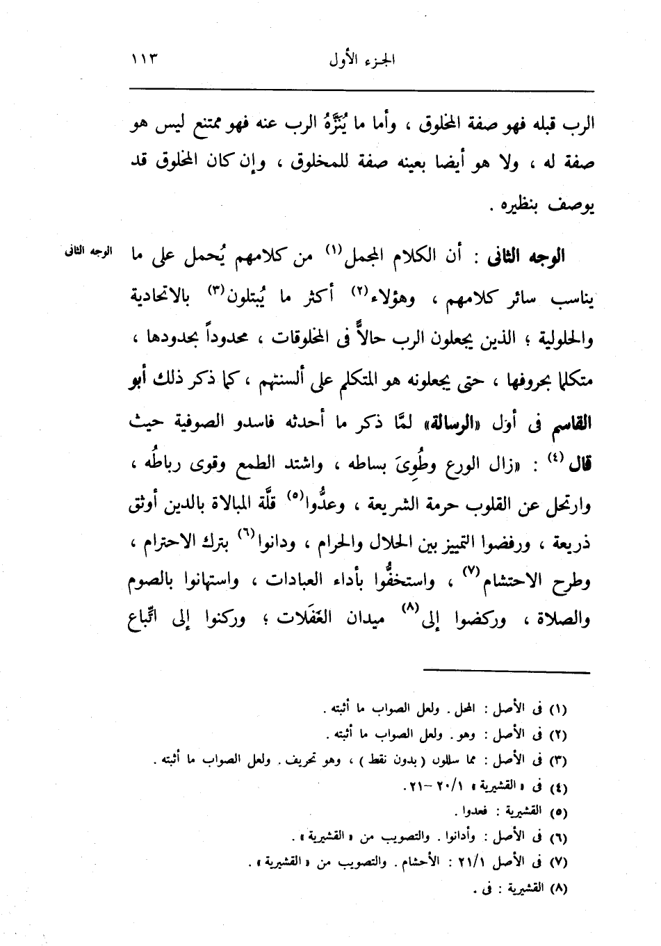 الْوَجْه الثَّانِي أَن الْكَلَام الْمُجْمل من كَلَامهم يحمل على مَا ينْسب سَائِر كَلَامهم وَهَؤُلَاء أَكثر مَا يبتلون بالاتحادية والحلولية الَّذين يجْعَلُونَ الرب حَالا فِي الْمَخْلُوقَات محدودا بحدودها متكلما بحروفها حَتَّى يجعلونه هُوَ الْمُتَكَلّم على ألسنتهم كَمَا ذكر ذَلِك أَبُو الْقَاسِم فِي أول الرساله لما ذكر مَا أحدثه فاسدو الصُّوفِيَّة حَيْثُ قَالَ زَالَ الْوَرع وطوى بساطه وَاشْتَدَّ الطمع وقوى رباطه وارتحل عَن الْقُلُوب حُرْمَة الشَّرِيعَة وعدوا قلَّة المبالاة بِالدّينِ أوثق ذَرِيعَة ورفضوا التَّمْيِيز بَين الْحَلَال وَالْحرَام ودانوا بترك الاحترام وَطرح الاحتشام واستخفوا بأَدَاء الْعِبَادَات واستهانوا بِالصَّوْمِ وَالصَّلَاة وركضوا إِلَى ميدان الغفلات وركنوا إِلَى اتِّبَاع