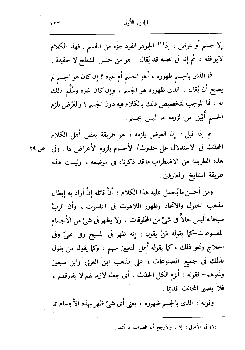 ثمَّ إِذا قيل إِن الْعرض يلْزمه هُوَ طَريقَة بعض أهل الْكَلَام الْمُحدث فِي الِاسْتِدْلَال على حُدُوث الْأَجْسَام بِلُزُوم الْأَعْرَاض لَهَا وَفِي هَذِه الطَّرِيقَة من الِاضْطِرَاب مَا قد ذَكرْنَاهُ فِي مَوْضِعه وَلَيْسَت هَذِه طَريقَة الْمَشَايِخ والعارفين