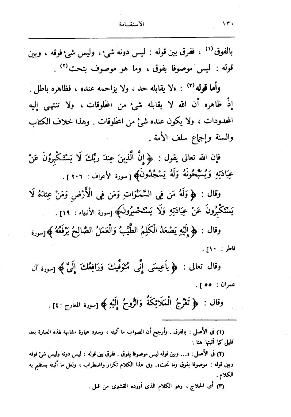 وَأما قَوْله لَا يُقَابله حد وَلَا يزاحمه عِنْد فَظَاهره بَاطِل إِذْ ظَاهره أَن الله لَا يُقَابله شئ من الْمَخْلُوقَات وَلَا تَنْتَهِي إِلَيْهِ المحدودات وَلَا يكون عِنْده شئ من الْمَخْلُوقَات وَهَذَا خلاف الْكتاب وَالسّنة وَإِجْمَاع سلف الامة