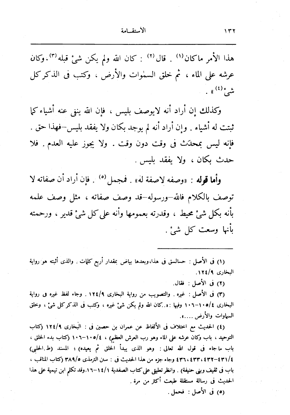 وَكَذَلِكَ إِن اراد أَنه لَا يُوصف بليس فَإِن الله ينفى عَنهُ أَشْيَاء كَمَا ثبتَتْ لَهُ أَشْيَاء وَإِن أَرَادَ أَنه لم يُوجد بكان وَلَا يفقد بليس فَهَذَا حق فَإِنَّهُ لَيْسَ بمحدث فِي وَقت دون وَقت وَلَا يجوز عَلَيْهِ الْعَدَم فَلَا حدث بكان وَلَا يفقد بليس