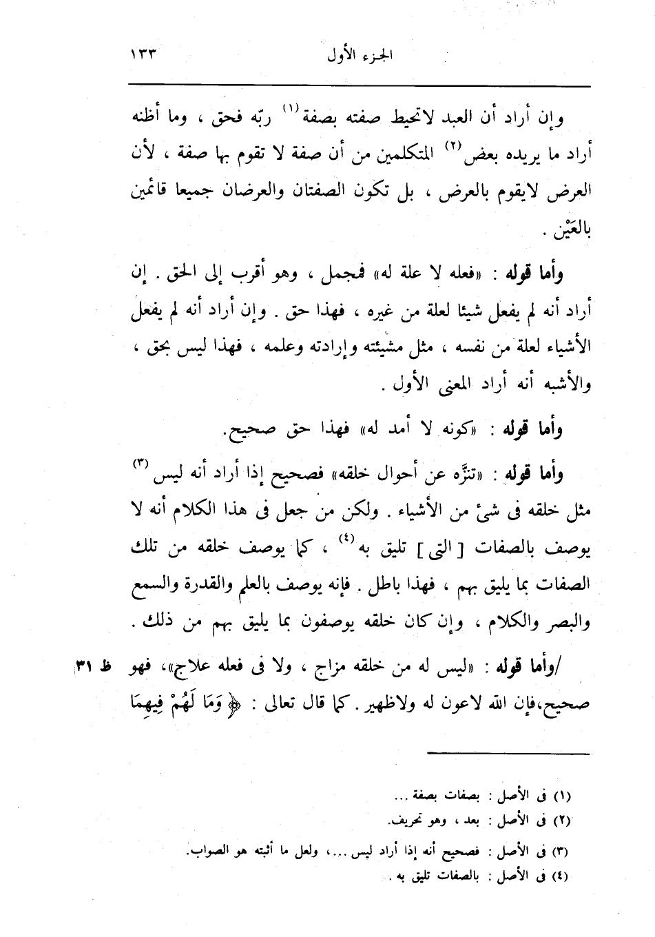 وَإِن أَرَادَ أَن العَبْد لَا تحيط صفته بِصفة ربه فَحق وَمَا أَظُنهُ أَرَادَ مَا يُريدهُ بعض الْمُتَكَلِّمين من أَن صفة لَا تقوم بهَا صفة لِأَن الْعرض لايقوم بِالْعرضِ بل تكون الصفتان والعرضان جَمِيعًا قَائِمين بِالْعينِ