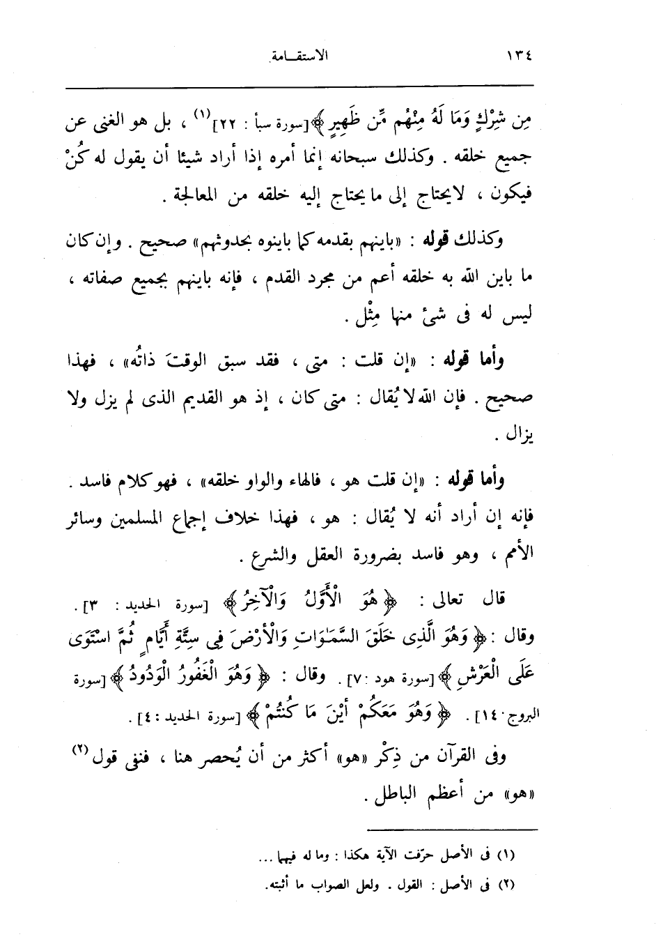 وَأما قَوْله إِن قلت مَتى فقد سبق الْوَقْت ذَاته فَهَذَا صَحِيح فَأن الله لَا يُقَال مَتى كَانَ إِذْ هُوَ الْقَدِيم الَّذِي لم يزل وَلَا يزَال
