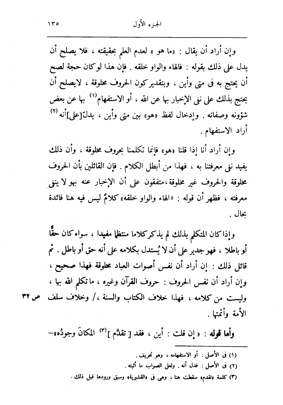 وَإِن أَرَادَ أَن يُقَال مَا هُوَ لعدم الْعلم بحقيقته فَلَا يصلح أَن يدل على ذَلِك بقوله فالهاء وَالْوَاو خلقه فَإِن هَذَا لَو كَانَ حجَّة لصَحَّ أَن يحْتَج بِهِ فِي مَتى وَأَيْنَ وَبِتَقْدِير كَون الْحُرُوف مخلوقة لَا يصلح أَن يحْتَج بذلك على نفى الْإِخْبَار بهَا عَن الله أَو الإستفهام بهَا عَن بعض شؤوونه وَصِفَاته وَإِدْخَال لفظ هُوَ بَين مَتى وَأَيْنَ يدل على أَنه أَرَادَ الِاسْتِفْهَام