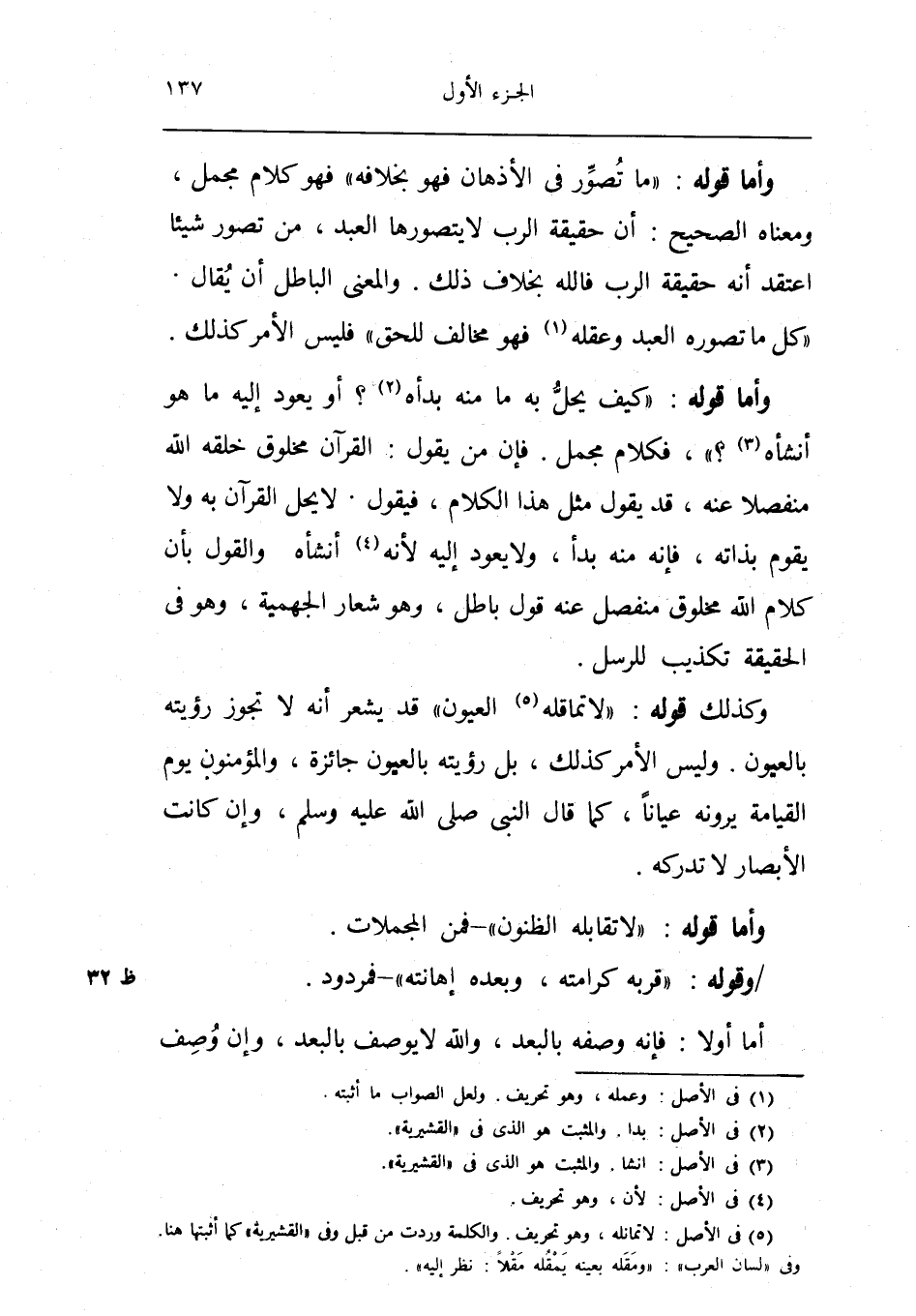 وَأما قَوْله كَيفَ يحل بِهِ مَا مِنْهُ بدأه أَو يعود إِلَيْهِ مَا هُوَ أنشأه فَكَلَام مُجمل فَإِن من يَقُول الْقُرْآن مَخْلُوق خلقه الله مُنْفَصِلا عَنهُ قد يَقُول مثل هَذَا الْكَلَام فَيَقُول لايحل الْقُرْآن بِهِ وَلَا يقوم بِذَاتِهِ فَإِنَّهُ مِنْهُ بَدَأَ وَلَا يعود إِلَيْهِ لِأَنَّهُ أنشأه وَالْقَوْل بِأَن كَلَام الله مَخْلُوق مُنْفَصِل عَن قَول بَاطِل وَهُوَ شعار الْجَهْمِية وَهُوَ فِي الْحَقِيقَة تَكْذِيب للرسل