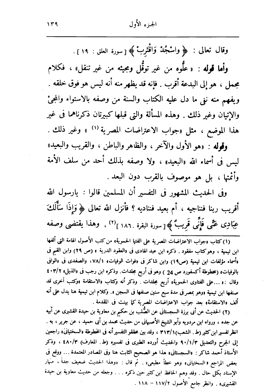 وَفِي الحَدِيث الْمَشْهُور فِي التَّفْسِير أَن الْمُسلمين قَالُوا يَا رَسُول الله أَقَرِيب رَبنَا فنناجيه أم بعيد فنناديه فَأنْزل الله وَإِذا سَأَلَك عبَادي عني فَإِنِّي قريب [سُورَة الْبَقَرَة 186] وَهَذَا يَقْتَضِي وَصفه