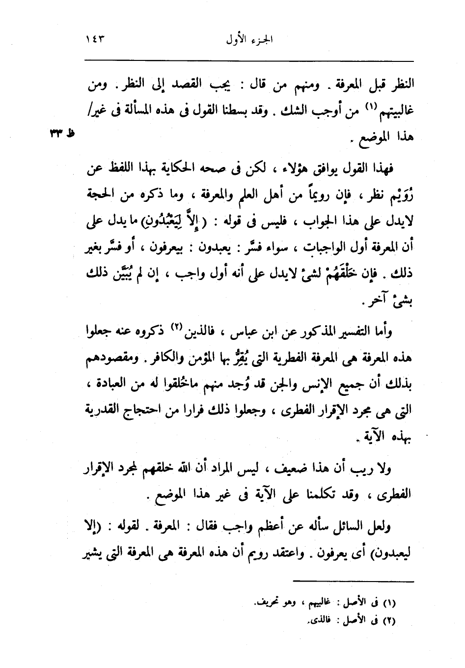 فَهَذَا القَوْل يُوَافق هَؤُلَاءِ لَكِن فِي صِحَة الْحِكَايَة بِهَذَا اللَّفْظ عَن رُوَيْم نظر فَإِن رويما من أهل الْعلم والمعرفة وَمَا ذكره من الْحجَّة لَا يدل على هَذَا الْجَواب فَلَيْسَ فِي قَوْله إِلَّا ليعبدون مَا يدل على أَن الْمعرفَة أول الْوَاجِبَات سَوَاء فسر يعْبدُونَ بيعرفون أَو فسر بِغَيْر ذَلِك فَإِن خلقهمْ لشئ لَا يدل على أَنه أول وَاجِب إِن لم يبين ذَلِك بشئ آخر