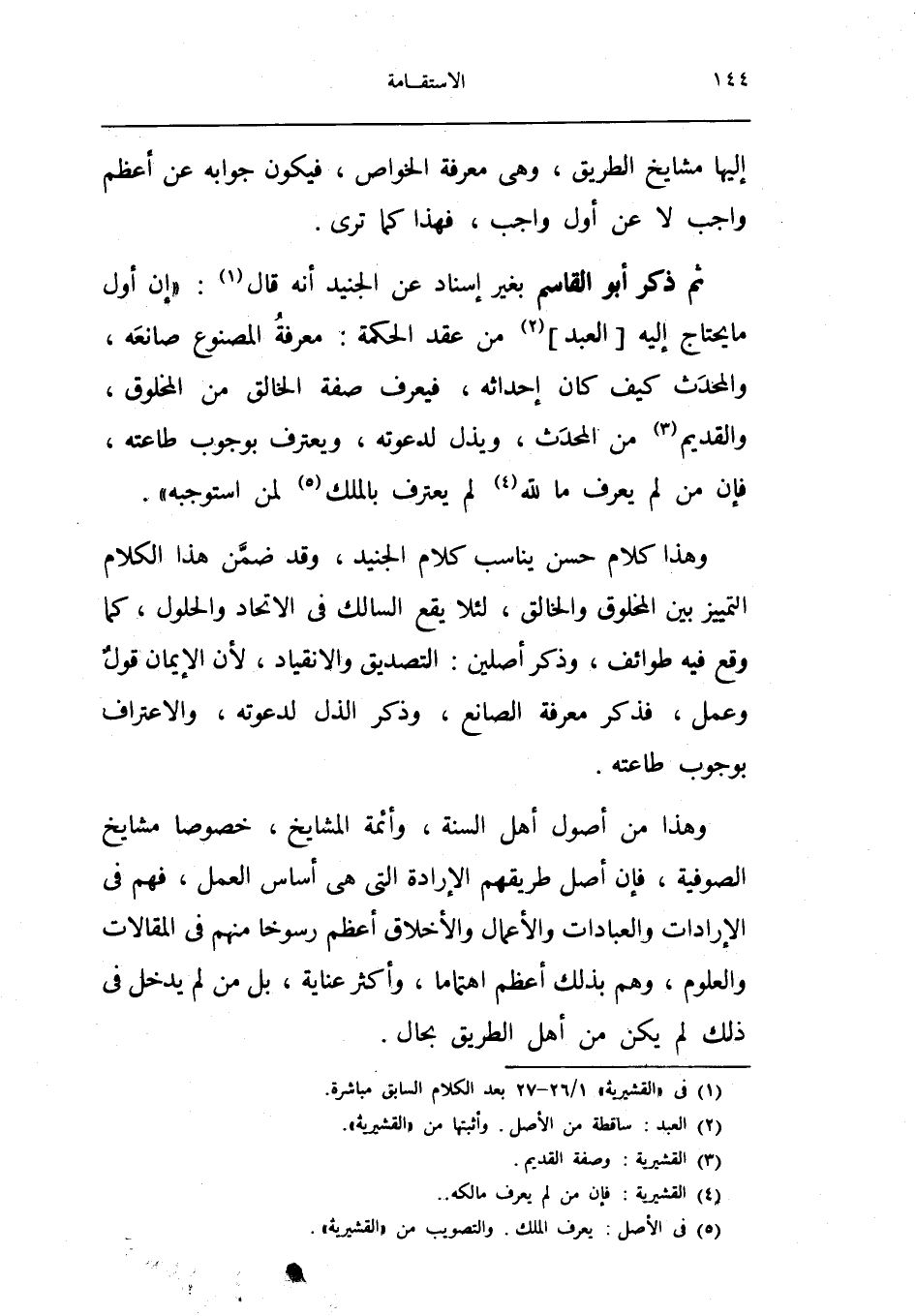 ثمَّ ذكر أَبُو الْقَاسِم بِغَيْر إِسْنَاد عَن الْجُنَيْد أَنه قَالَ إِن أول مَا يحْتَاج إِلَيْهِ العَبْد من عقد الْحِكْمَة معرفَة الْمَصْنُوع صانعه والمحدث كَيفَ كَانَ إحداثه فَيعرف صفة الْخَالِق من الْمَخْلُوق وَالْقَدِيم من الْمُحدث ويذل لدعوته ويتعرف بِوُجُوب طَاعَته فَإِن لم يعرف مَا لله لم يعْتَرف بِالْملكِ لمن استوجبه