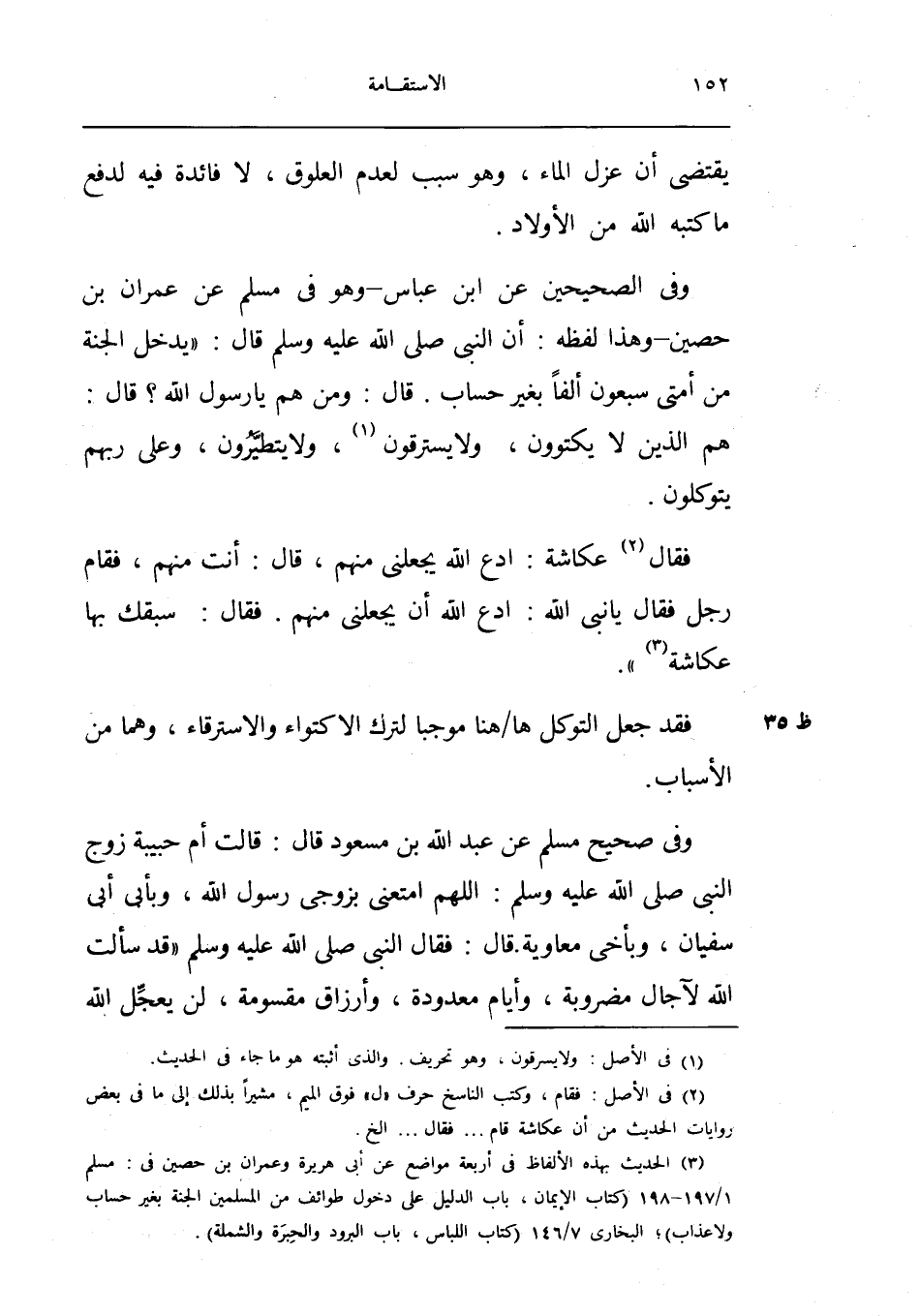 وَفِي الصَّحِيحَيْنِ عَن ابْن عَبَّاس وَهُوَ فِي مُسلم عَن عمرَان بن حُصَيْن وَهَذَا لَفظه أَن النَّبِي صلى الله عَلَيْهِ وَسلم قَالَ يدْخل الْجنَّة من أمتِي سَبْعُونَ ألفا بِغَيْر حِسَاب قَالَ وَمن هم يَا رَسُول الله قَالَ هم الَّذين لَا يَكْتَوُونَ وَلَا يسْتَرقونَ وَلَا يَتَطَيَّرُونَ وعَلى رَبهم يَتَوَكَّلُونَ