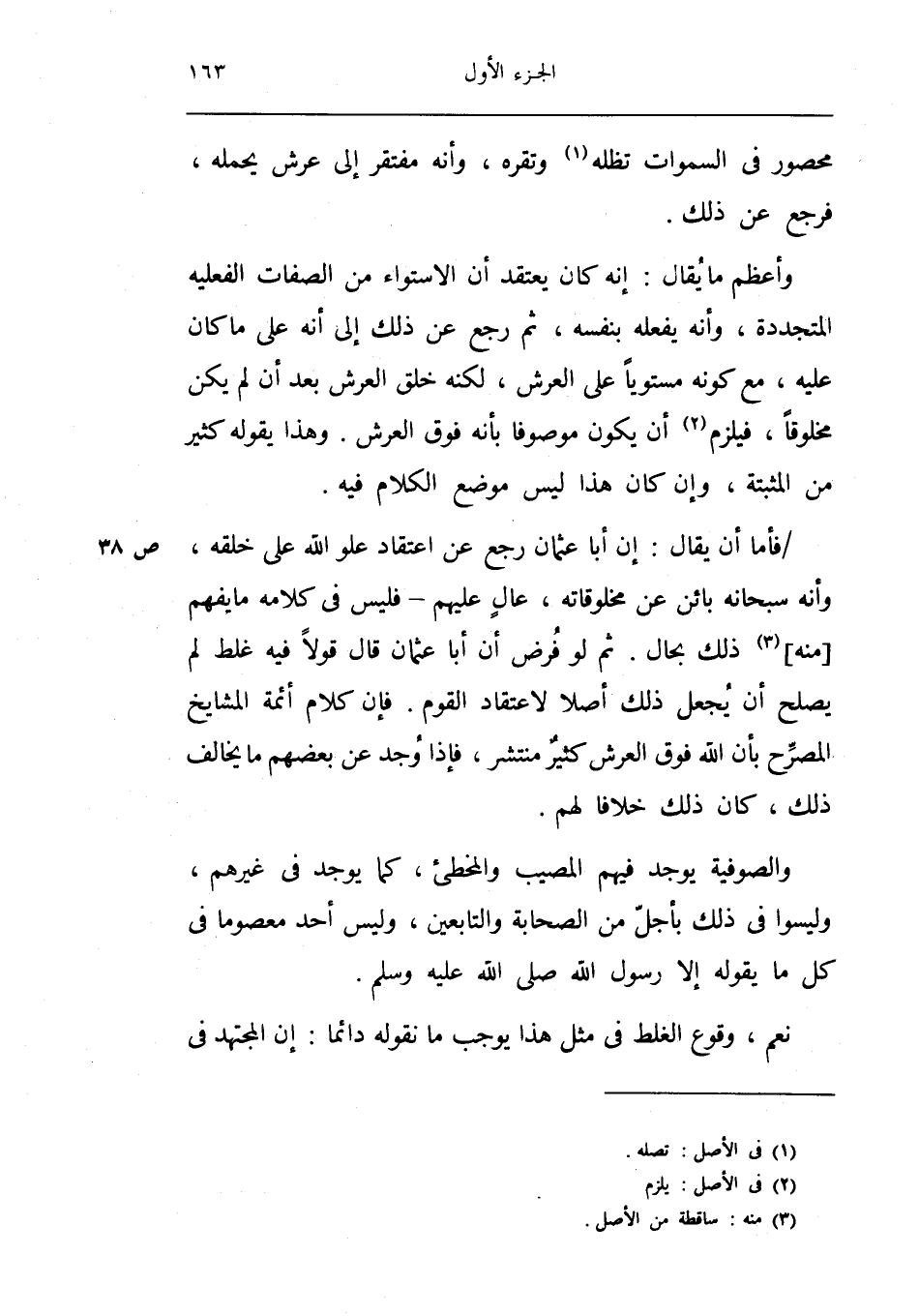 فَأَما أَن يُقَال إِن أَبَا عُثْمَان رَجَعَ عَن اعْتِقَاد علو الله على خلقه وَأَنه سُبْحَانَهُ بَائِن عَن مخلوقاته عَال عَلَيْهِم فَلَيْسَ فِي كَلَامه مَا يفهم مِنْهُ ذَلِك بِحَال ثمَّ لَو فرض أَن أَبَا عُثْمَان قَالَ قولا فِيهِ غلط لم يصلح أَن يَجْعَل ذَلِك أصلا لاعتقاد الْقَوْم فَإِن كَلَام أَئِمَّة الْمَشَايِخ الْمُصَرّح بِأَن الله فَوق الْعَرْش كثير منتشر فَإِذا وجد عَن بَعضهم مَا يُخَالف ذَلِك كَانَ ذَلِك خلافًا لَهُم