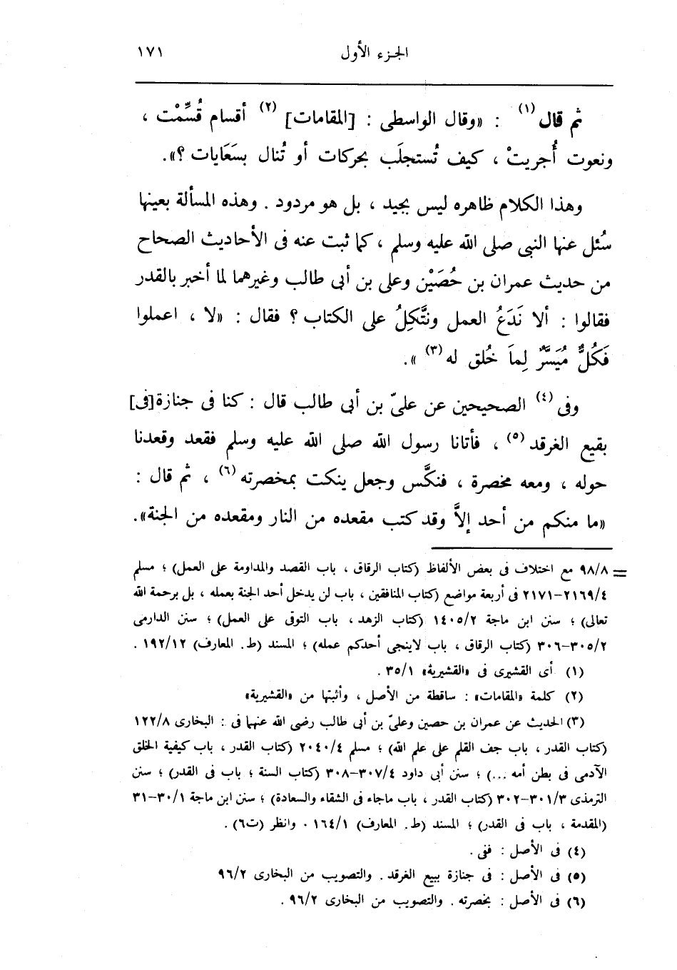 وَفِي الصَّحِيحَيْنِ عَن عَليّ بن ابي طَالب قَالَ كُنَّا فِي جَنَازَة فِي بَقِيع الْغَرْقَد فَأَتَانَا رَسُول الله صلى الله عَلَيْهِ وَسلم فَقعدَ وقعدنا حوله وَمَعَهُ مخصرة فَنَكس وَجعل ينكت بمخسرته ثمَّ قَالَ مَا مِنْكُم من أحد إِلَّا وَقد كتب مَقْعَده من النَّار ومقعده من الْجنَّة