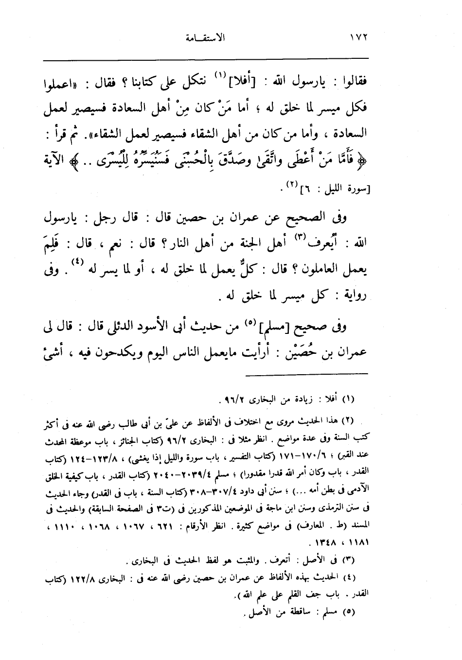 فَقَالُوا يَا رَسُول الله أَفلا نَتَّكِل على كتَابنَا فَقَالَ اعْمَلُوا فَكل ميسر لما خلق لَهُ أما من كَانَ من أهل السَّعَادَة فسيصير لعمل السعاده واما من كَانَ من أهل الشَّقَاء فسيصير لعمل الشِّفَاء ثمَّ قَرَأَ فَأَما من أعْطى وَاتَّقَى وَصدق بِالْحُسْنَى فسنيسره لليسرى [سُورَة اللَّيْل 6]