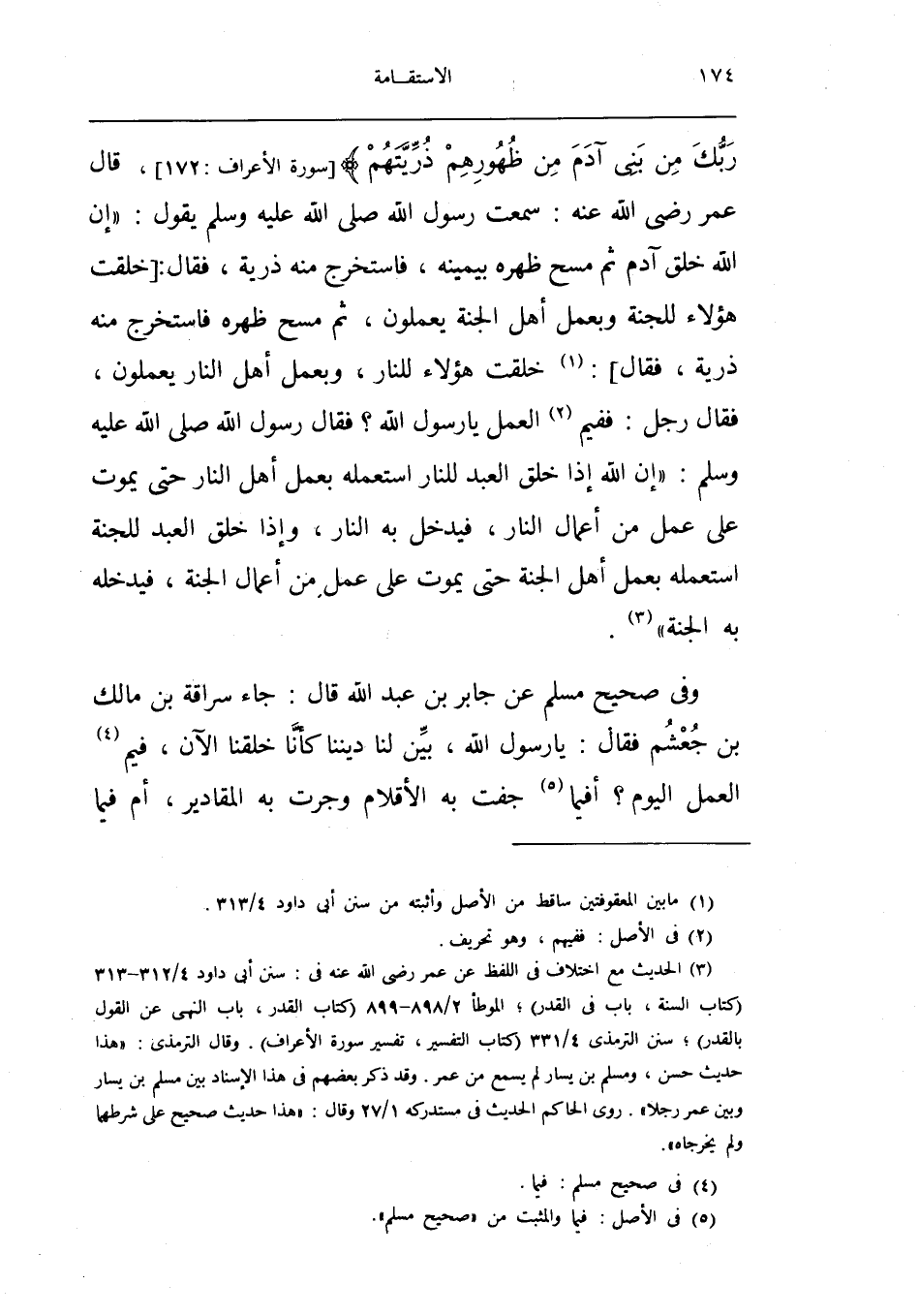 رَبك من بني آدم من ظُهُورهمْ ذُرِّيتهمْ [سُورَة الاعراف 172] قَالَ عمر رضى الله عَنهُ سَمِعت رَسُول ص يَقُول إِن الله خلق آدم ثمَّ مسح ظَهره بِيَمِينِهِ فأستخرج مِنْهُ ذُرِّيَّة فَقَالَ [خلقت هَؤُلَاءِ للجنة وبعمل أهل الْجنَّة يعْملُونَ ثمَّ مسح ظَهره فأستخرج مِنْهُ ذُرِّيَّة فَقَالَ] خلقت هَؤُلَاءِ للنار وبعمل أهل النَّار يعْملُونَ فَقَالَ رجل فَفِيمَ الْعَمَل يَا رَسُول الله فَقَالَ رَسُول الله صلى الله عَلَيْهِ وَسلم إِن الله إِذا خلق العَبْد للنار اسْتَعْملهُ بِعَمَل اهل النَّار حَتَّى يَمُوت على عمل من أَعمال النَّار فَيدْخل بِهِ النَّار وَإِذا خلق العَبْد للجنة اسْتَعْملهُ بِعَمَل أهل الْجنَّة حَتَّى يَمُوت على عمل من أَعمال الْجنَّة فيدخله بِهِ الْجنَّة