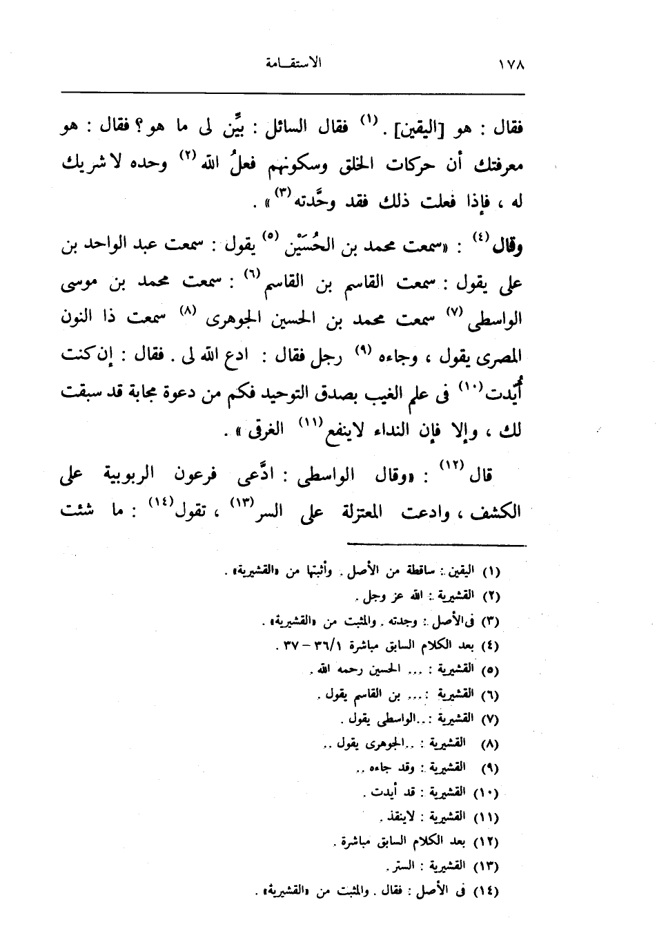 فَقَالَ هُوَ الْيَقِين فَقَالَ السَّائِل بَين لي مَا هُوَ فَقَالَ هُوَ معرفتك أَن حركات الْخلق وسكونهم فعل الله وَحده لَا شريك لَهُ فَإِذا فعلت ذَلِك فقد وحدته وَقَالَ سَمِعت مُحَمَّد بن الْحُسَيْن يَقُول سَمِعت عبد الْوَاحِد بن عَليّ يَقُول سَمِعت الْقَاسِم بن الْقَاسِم سَمِعت مُحَمَّد بن مُوسَى الوَاسِطِيّ سَمِعت مُحَمَّد بن الْحُسَيْن الْجَوْهَرِي سَمِعت ذَا النُّون الْمصْرِيّ يَقُول وجاءه رجل فَقَالَ ادْع الله لي فَقَالَ إِن كنت أيدت فِي علم الْغَيْب بِصدق التَّوْحِيد فكم من دَعْوَة مجابة قد سبقت لَك وَإِلَّا فَإِن النداء لَا ينفع الغرقى