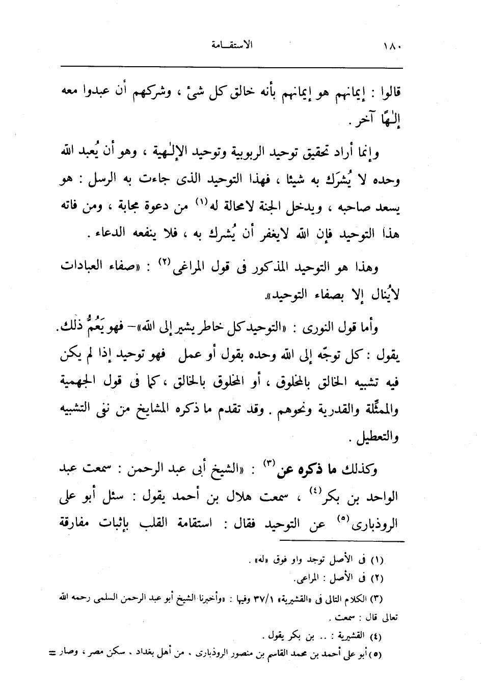 وَكَذَلِكَ مَا ذكره عَن الشَّيْخ أبي عبد الرَّحْمَن سَمِعت عبد الْوَاحِد بن بكر سَمِعت هِلَال بن أَحْمد يَقُول سُئِلَ أَبُو عَليّ الرُّوذَبَارِي عَن التَّوْحِيد فَقَالَ استقامة الْقلب بِإِثْبَات مُفَارقَة