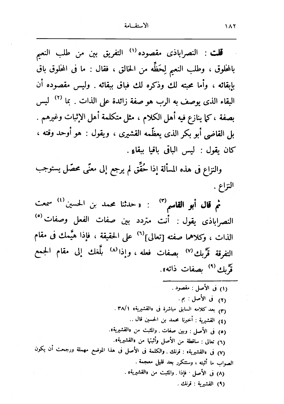 قلت النصراباذي مَقْصُوده التَّفْرِيق بَين من طلب النَّعيم بالمخلوق وَطلب النَّعيم لحظه من الْخَالِق فَقَالَ مَا فِي الْمَخْلُوق بَاقٍ بإبقائه وَأما محبته لَك وَذكره لَك فباق بِبَقَائِهِ وَلَيْسَ مَقْصُوده أَن الْبَقَاء الَّذِي يُوصف بِهِ الرب هُوَ صفة زَائِدَة على الذَّات بِمَا لَيْسَ بِصفة كَمَا يُنَازع فِيهِ أهل الْكَلَام مثل متكلمة أهل الْإِثْبَات وَغَيرهم بل القَاضِي أَبُو بكر الَّذِي يعظمه الْقشيرِي وَيَقُول هُوَ اوحد وقته كَانَ يَقُول لَيْسَ الْبَاقِي بَاقِيا بِبَقَاء