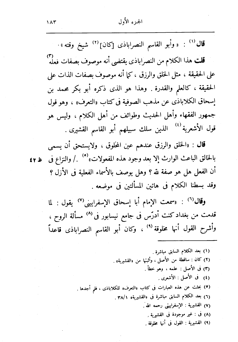 قلت هَذَا الْكَلَام من النصراباذي يَقْتَضِي أَنه مَوْصُوف بِصِفَات فعله على الْحَقِيقَة مثل الْخلق والرزق كَمَا أَنه مَوْصُوف بِصِفَات الذَّات عل ى الْحَقِيقَة كَالْعلمِ وَالْقُدْرَة وَهَذَا هوالذي ذكره أَبُو بكر مُحَمَّد بن إِسْحَاق الكلاباذي عَن مَذْهَب الصُّوفِيَّة فِي كتاب التعرف وَهُوَ قَول جُمْهُور الْفُقَهَاء وَأهل الحَدِيث وَطَوَائِف من اهل الْكَلَام وَلَيْسَ هُوَ قَول الأشعرية الَّذين سلك سبيلهم أَبُو الْقَاسِم الْقشيرِي