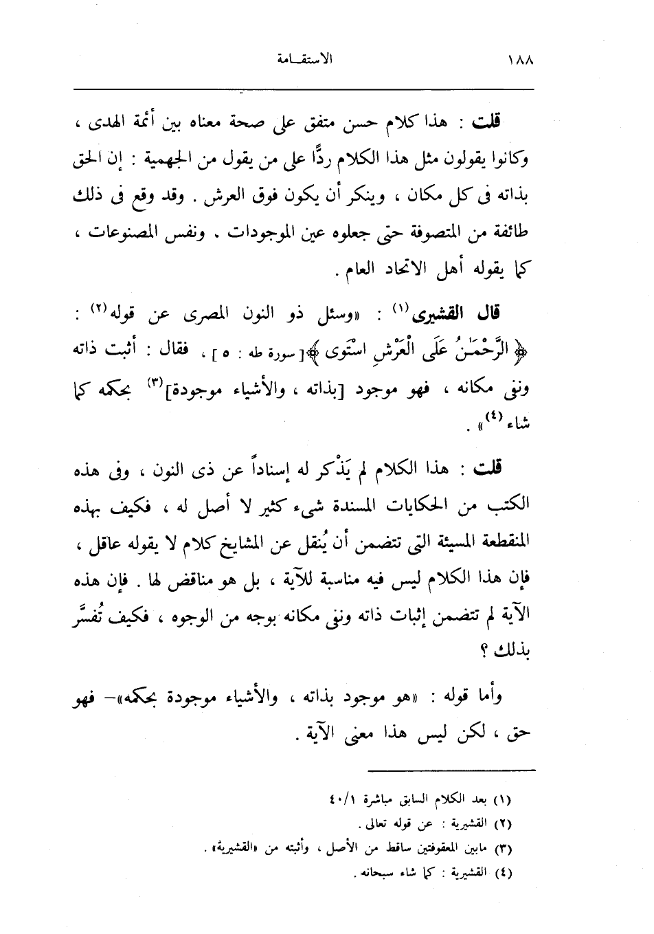 قَالَ الْقشيرِي وَسُئِلَ ذُو النُّون الْمصْرِيّ عَن قَوْله الرَّحْمَن على الْعَرْش اسْتَوَى [سُورَة طه 5] فَقَالَ اثْبتْ ذَاته وَنفى مَكَانَهُ فَهُوَ مَوْجُود [بِذَاتِهِ والأشياء مَوْجُودَة] بِحكمِهِ كَمَا شَاءَ