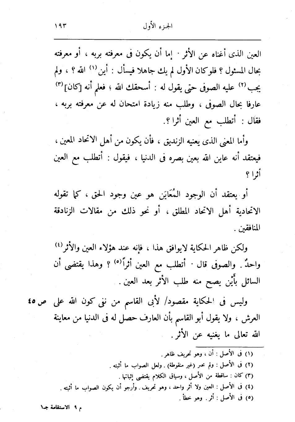 الْعين الَّذِي أغناه عَن الْأَثر إِمَّا أَن يكون فِي مَعْرفَته بربه أَو مَعْرفَته بِحَال الْمَسْئُول فَلَو كَانَ الأول لم يَك جَاهِلا فَيسْأَل أَيْن الله وَلم يجب عَلَيْهِ الصُّوفِي حَتَّى يَقُول لَهُ أسحقك الله فَعلم أَنه كَانَ عَارِفًا بِحَال الصُّوفِي وَطلب مِنْهُ زِيَادَة امتحان لَهُ عَن مَعْرفَته بربه فَقَالَ أتطلب مَعَ الْعين أثرا
