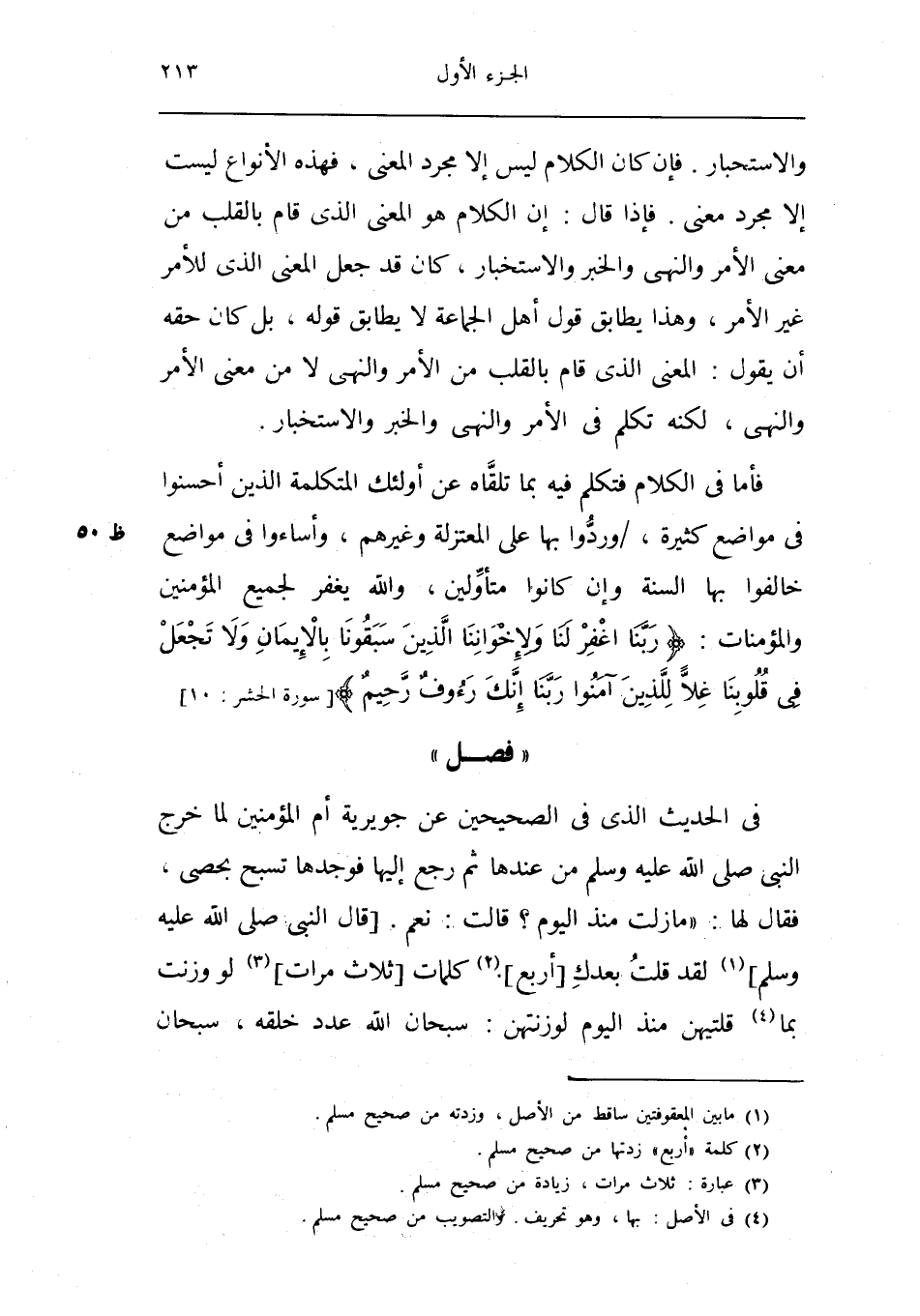 فَأَما فِي الْكَلَام فَتكلم فِيهِ بِمَا تَلقاهُ عَن أُولَئِكَ المتكلمة الَّذين أَحْسنُوا فِي مَوَاضِع كَثِيرَة وردوا بهَا على الْمُعْتَزلَة وَغَيرهم وأساءوا فِي مَوَاضِع خالفوا بهَا السّنة وَإِن كَانُوا متأولين وَالله يغْفر لجَمِيع الْمُؤمنِينَ وَالْمُؤْمِنَات رَبنَا اغْفِر لنا وَلِإِخْوَانِنَا الَّذين سبقُونَا بِالْإِيمَان وَلَا تجْعَل فِي قُلُوبنَا غلا للَّذين آمنُوا رَبنَا إِنَّك رءوف رَحِيم [سُورَة الْحَشْر 10]