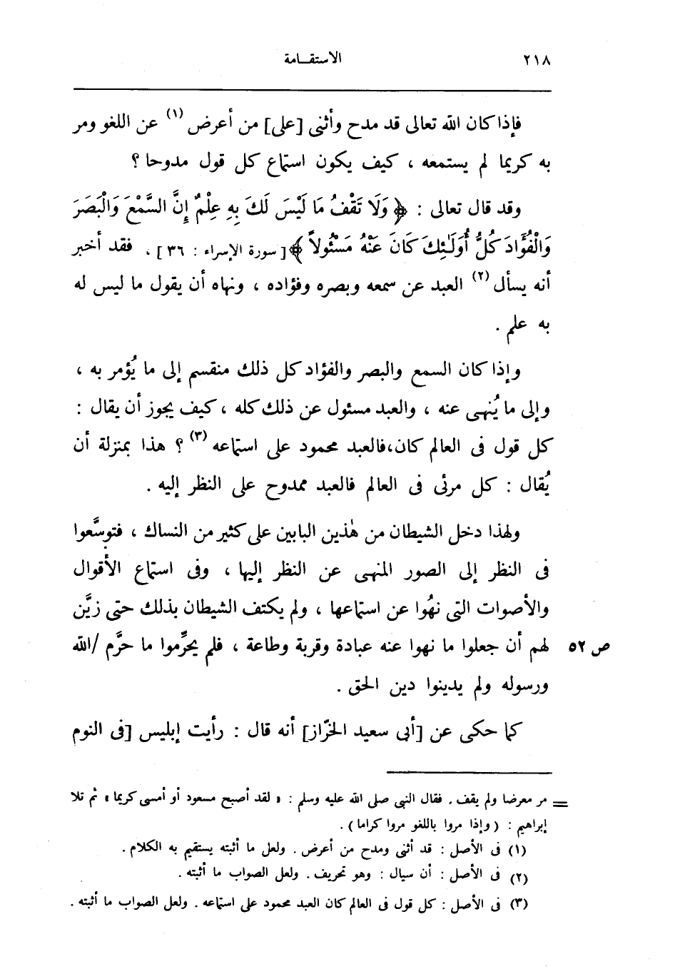 وَإِذا كَانَ السّمع وَالْبَصَر والفؤاد كل ذَلِك منقسم إِلَى مَا يُؤمر بِهِ وَإِلَى مَا ينْهَى عَنهُ وَالْعَبْد مسئول عَن ذَلِك كُله كَيفَ يجوز أَن يُقَال كل قَول فِي الْعَالم كَانَ فَالْعَبْد مَحْمُود على استماعه هَذَا بِمَنْزِلَة أَن يُقَال كل مرئي فِي الْعَالم فَالْعَبْد ممدوح على النّظر إِلَيْهِ