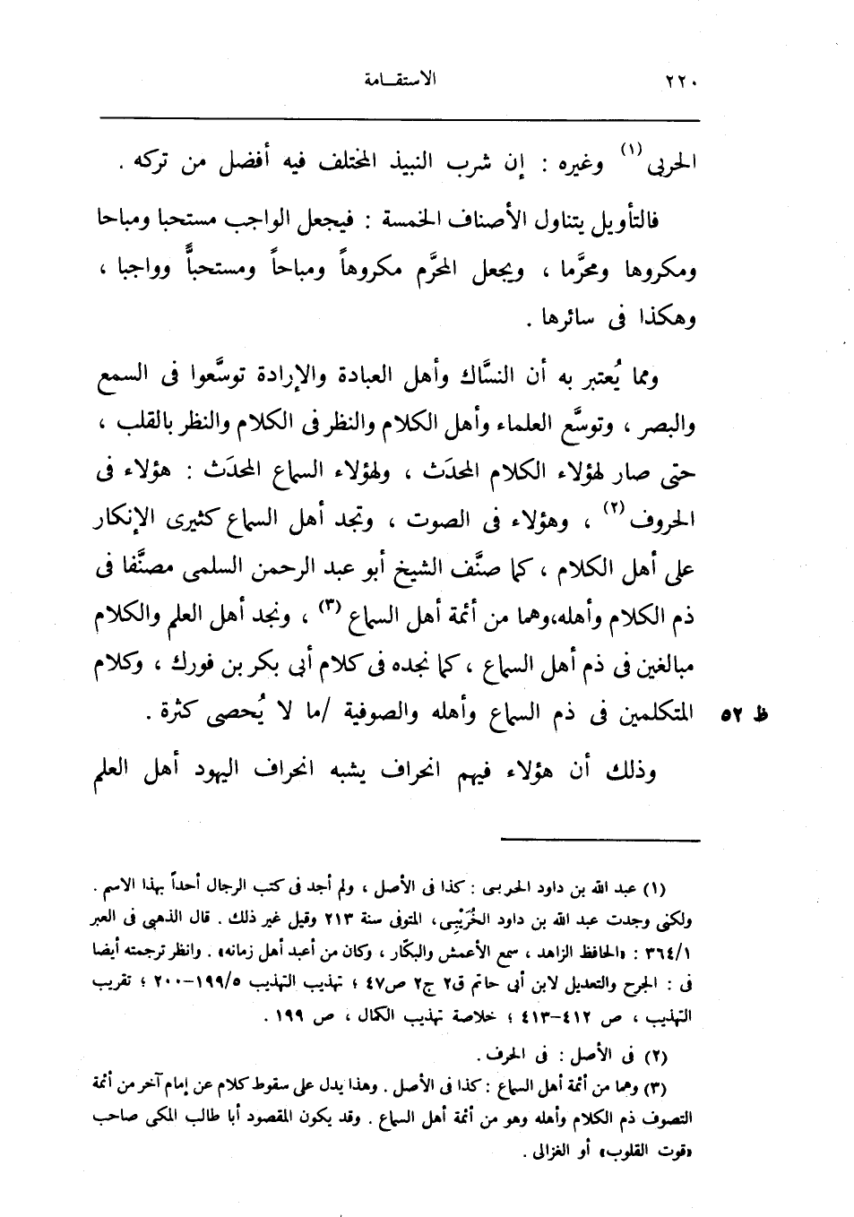 وَمِمَّا يعْتَبر بِهِ أَن النساك وَأهل الْعِبَادَة والإرادة توسعوا فِي السّمع وَالْبَصَر وَتوسع الْعلمَاء وَأهل الْكَلَام وَالنَّظَر فِي الْكَلَام وَالنَّظَر بِالْقَلْبِ حَتَّى صَار لهَؤُلَاء الْكَلَام الْمُحدث ولهؤلاء السماع الْمُحدث هَؤُلَاءِ فِي الْحُرُوف وَهَؤُلَاء فِي الصَّوْت وتجد أهل السماع كثيري الْإِنْكَار على أهل الْكَلَام كَمَا صنف الشَّيْخ ابو عبد الرَّحْمَن السّلمِيّ مصنفا فِي ذمّ الْكَلَام وَأَهله وهما من أَئِمَّة أهل السماع ونجد أهل الْعلم وَالْكَلَام مبالغين فِي ذمّ أهل السماع كَمَا نجده فِي كَلَام أبي بكر بن فورك وَكَلَام الْمُتَكَلِّمين فِي ذمّ السماع وَأَهله والصوفية مَا لَا يُحْصى كَثْرَة