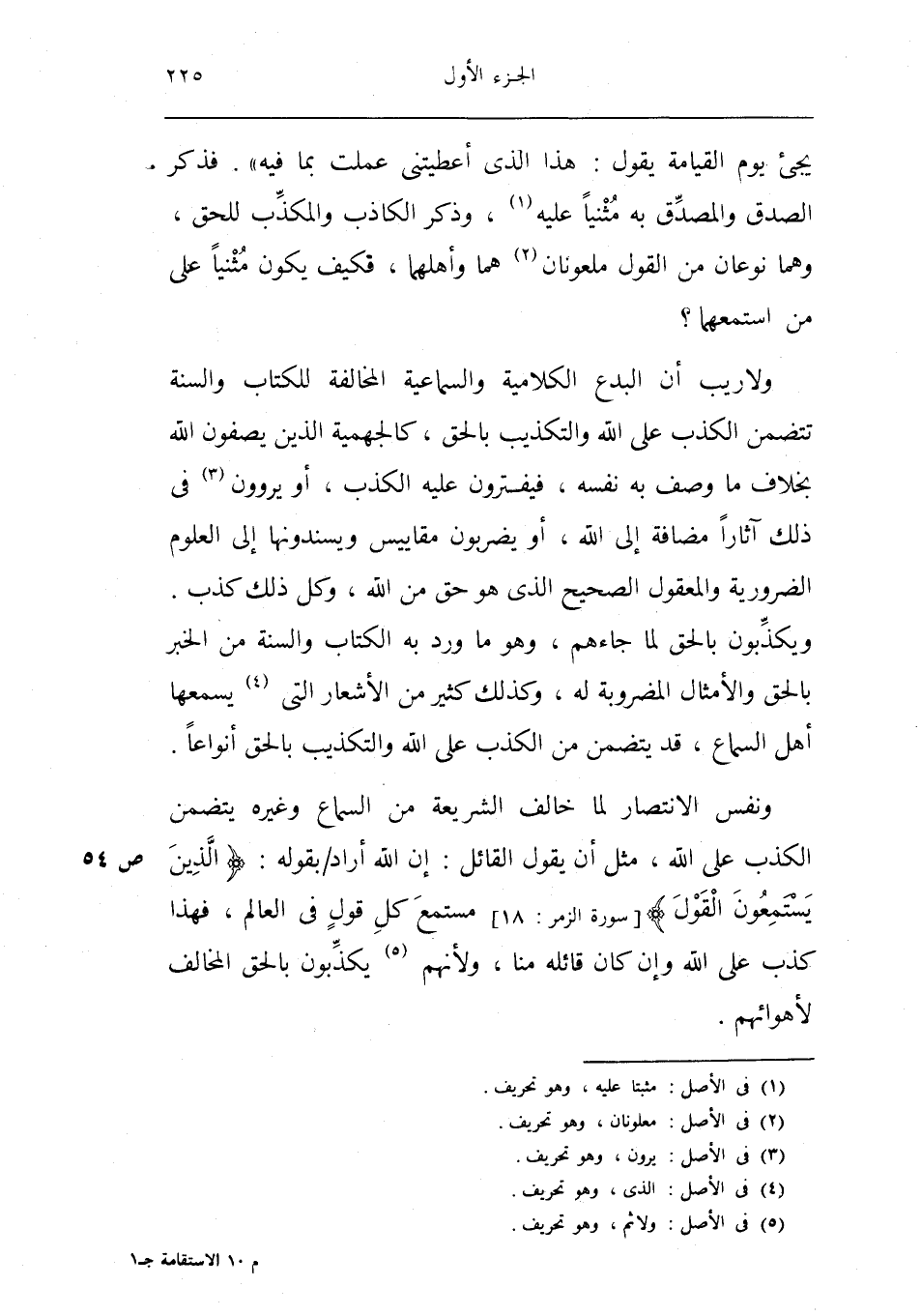 وَلَا ريب أَن الْبِدْعَة الكلامية والسماعية الْمُخَالفَة للْكتاب وَالسّنة تَتَضَمَّن الْكَذِب على الله والتكذيب بِالْحَقِّ كالجهمية الَّذين يصفونَ الله بِخِلَاف ماوصف بِهِ نَفسه فيفترون عَلَيْهِ الْكَذِب أَو يروون فِي ذَلِك آثَار مُضَافَة إِلَى الله أَو يضْربُونَ مقاييس ويسندونها إِلَى الْعُلُوم الضرورية والمعقول الصَّحِيح الَّذِي هُوَ حق من الله وكل ذَلِك كذب ويكذبون بِالْحَقِّ لما جَاءَهُ وَهُوَ مَا ورد بِهِ الْكتاب وَالسّنة من الْخَبَر بِالْحَقِّ والأمثال المضروبة لَهُ وَكَذَلِكَ كثير من الأشعارالتي يسْمعهَا اهل السماع قد يتَضَمَّن من الْكَذِب على الله والتكذيب بِالْحَقِّ أنواعا