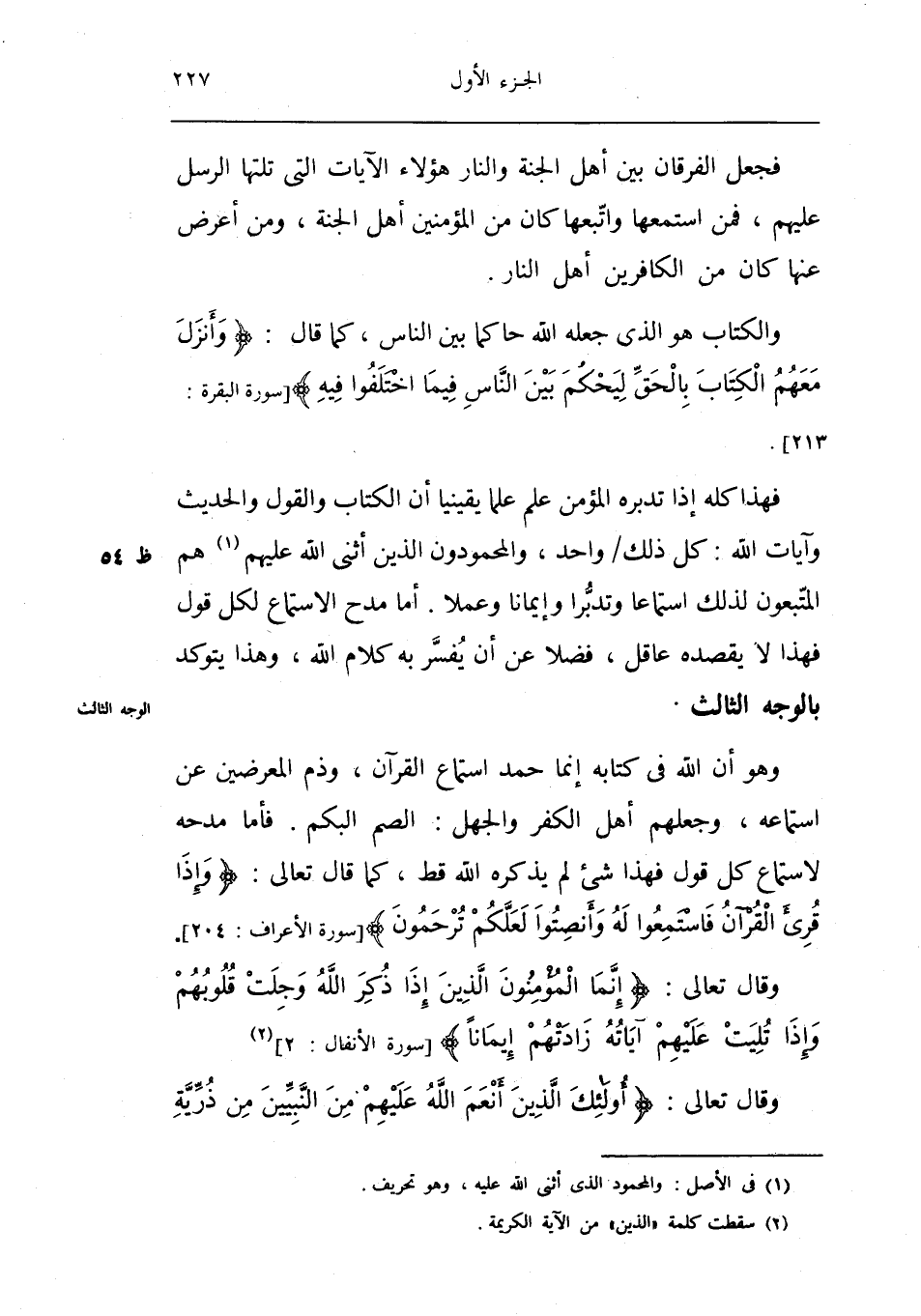 فَهَذَا كُله إِذا تدبره الْمُؤمن علم علما يَقِينا أَن الْكتاب وَالْقَوْل والْحَدِيث وآيات الله كل ذَلِك وَاحِد والمحمودون الَّذين أثنى الله عَلَيْهِم هم المتبعون لذَلِك استماعا وتدبرا وإيمانا وَعَملا أما مدح الِاسْتِمَاع لكل قَول فَهَذَا لَا يَقْصِدهُ عَاقل فضلا عَن ان يُفَسر بِهِ كَلَام الله وَهَذَا يتوكد بِالْوَجْهِ الثَّالِث